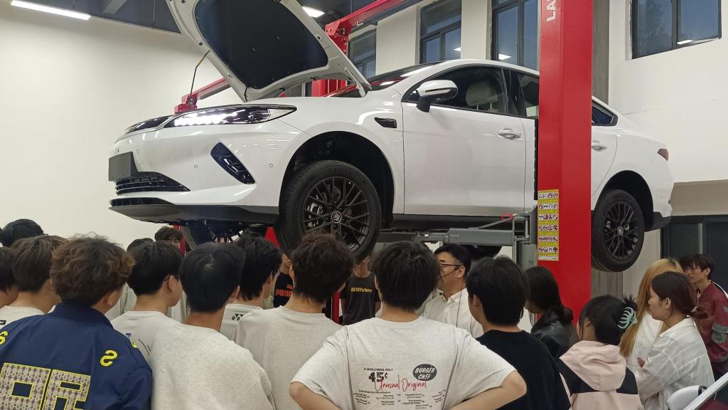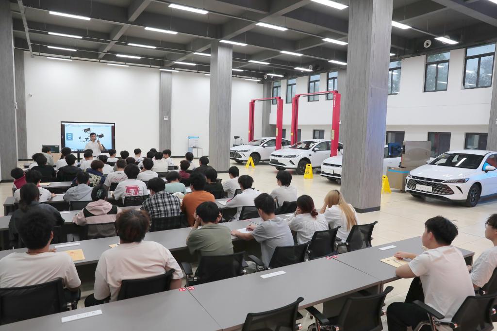 在实训中心正式启用的第一堂课上,新能源汽车结构与故障检测实训室4台教学用比亚迪新能源汽车摆成一排,24级新能源专5班的46名同学在任课老师陈列的指导下,深入了解新能源汽车的底盘结构、三电驱动控制系统、整车故障检测与诊断技术等。不少同学兴奋地表示,“在这么多功能齐全、看得见摸得着的实训设备平台面前,上课特别直观,我们对学好专业更有信心,学习兴趣也更浓了!”