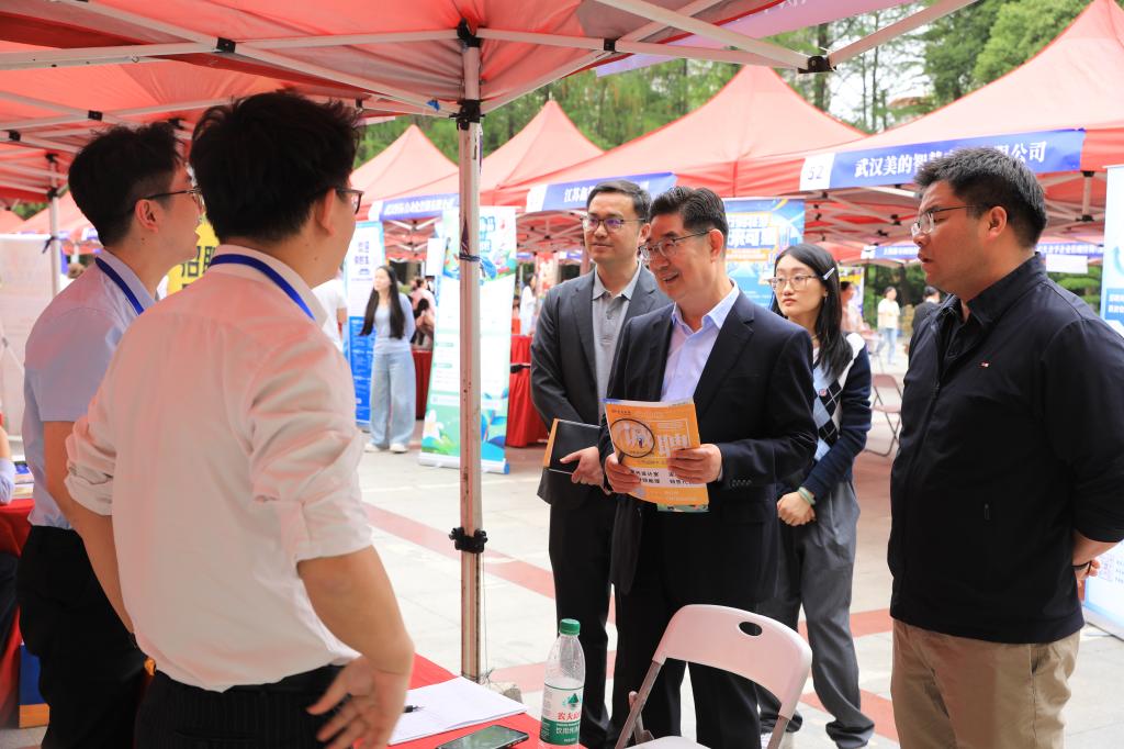 4月23日,湖北商贸学院武汉校区举办"就在武汉 创赢未来"2025届毕业生春季校园双选会。执行校长钱建国、副校长程胜军出席活动,各职能部门负责人及各学院党政领导共同参与,81家优质企业携近五千个就业岗位到场招聘,吸引2000余名应届毕业生现场求职。
