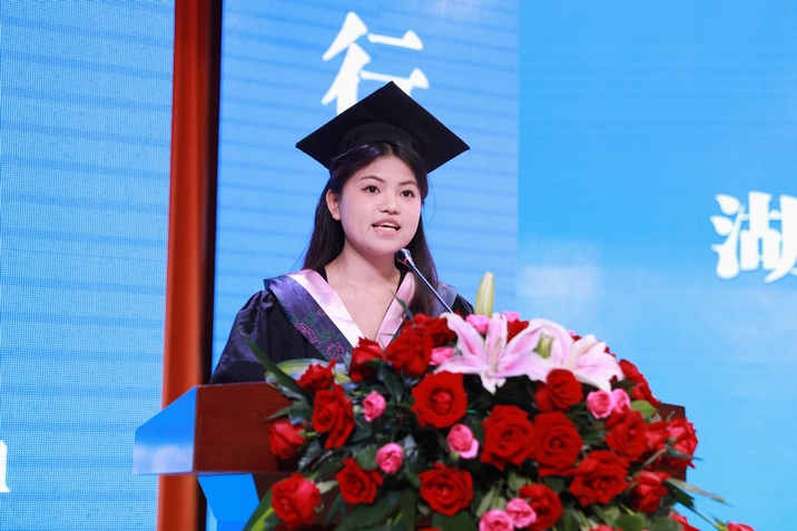 教育学院2021级王思思同学、体育与健康学院2023级高梦妮同学作为优秀毕业生代表,深情回顾了求学四载的成长点滴,表达了对母校的眷恋以及对未来的憧憬。他们结合自身奋斗历程,为学弟学妹们分享了宝贵经验,并送上诚挚祝福。