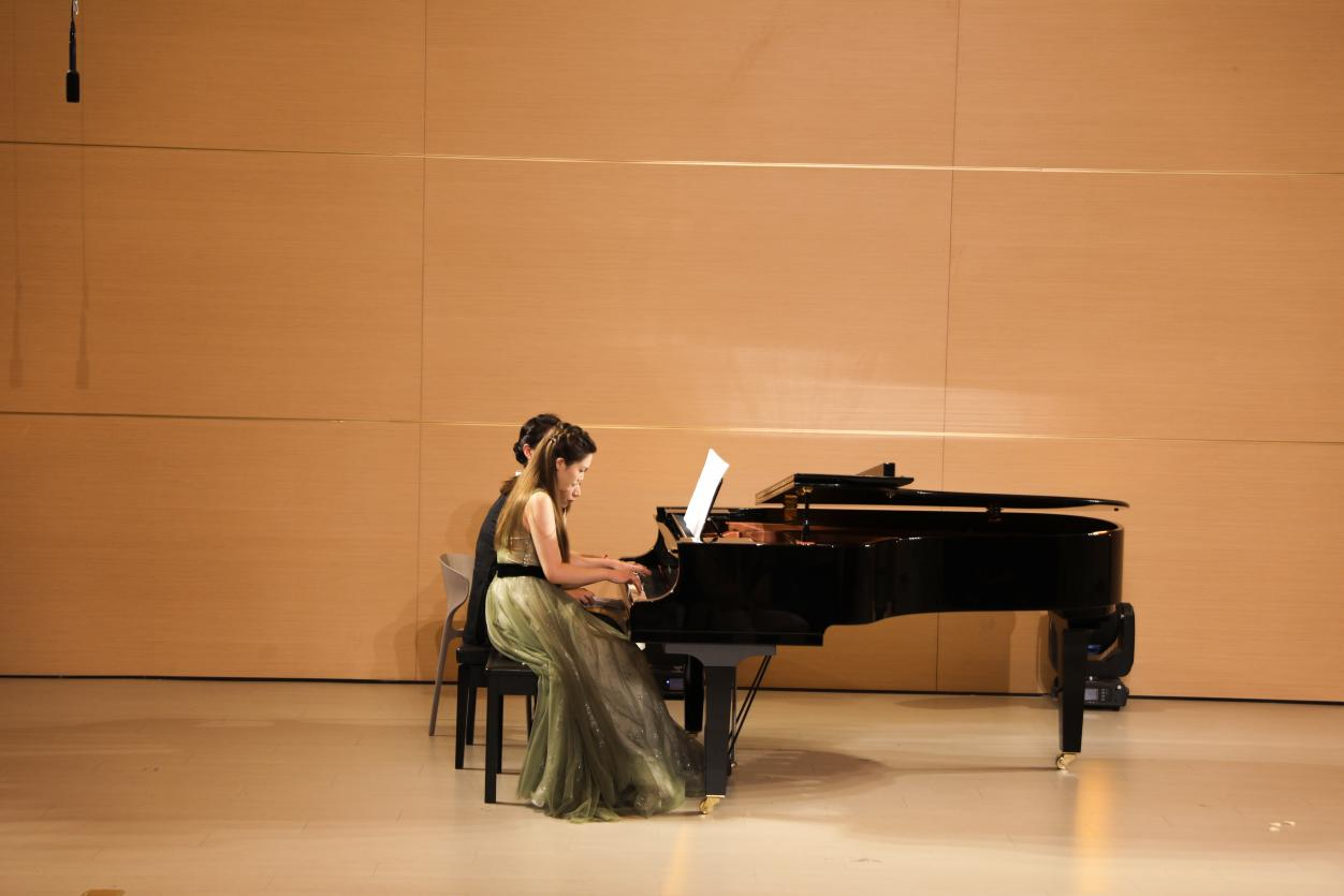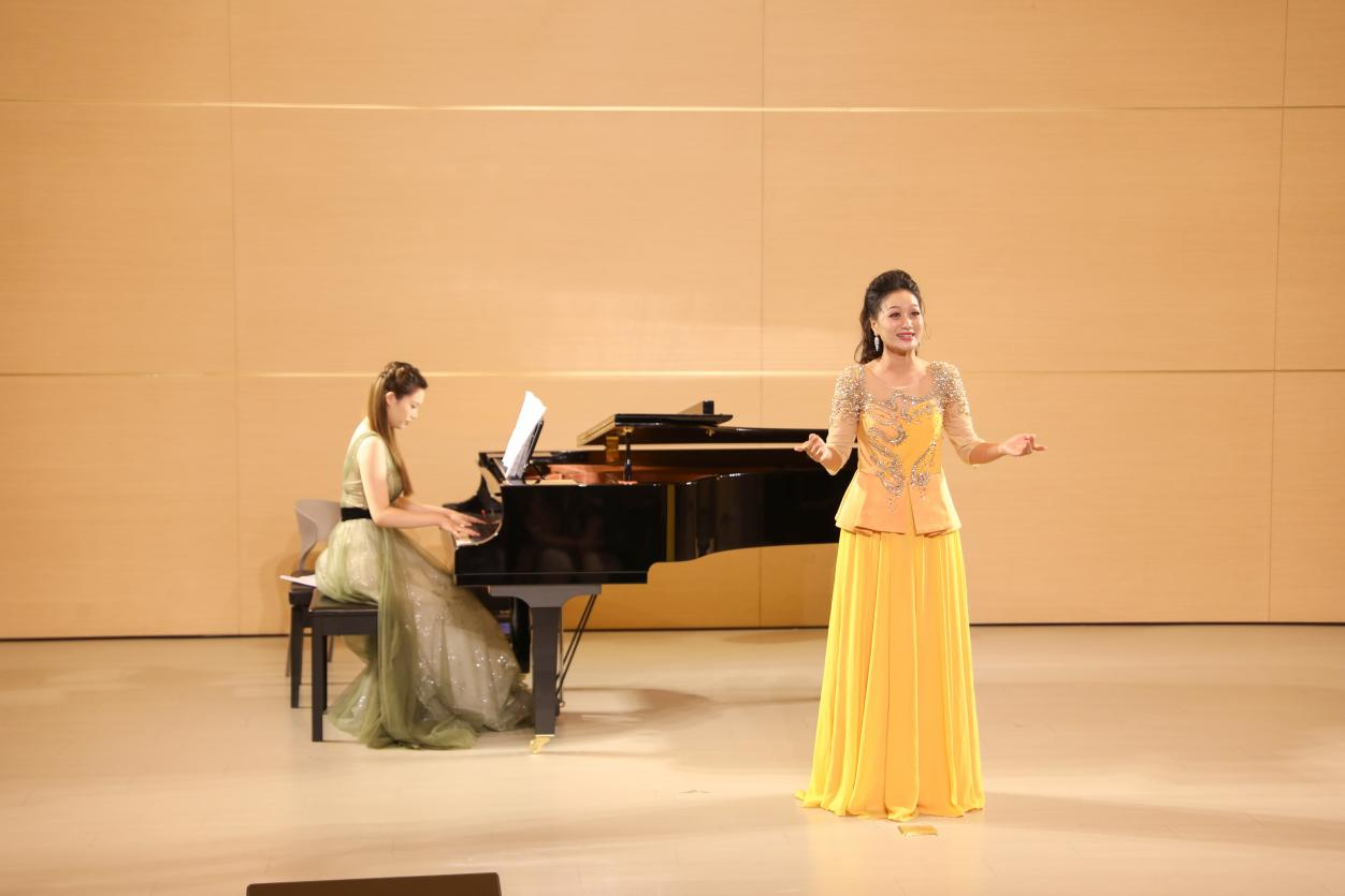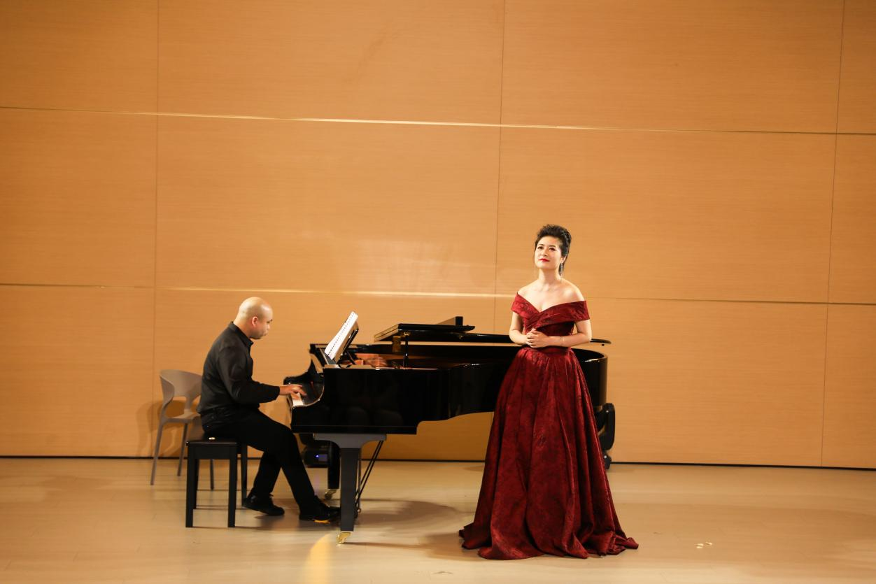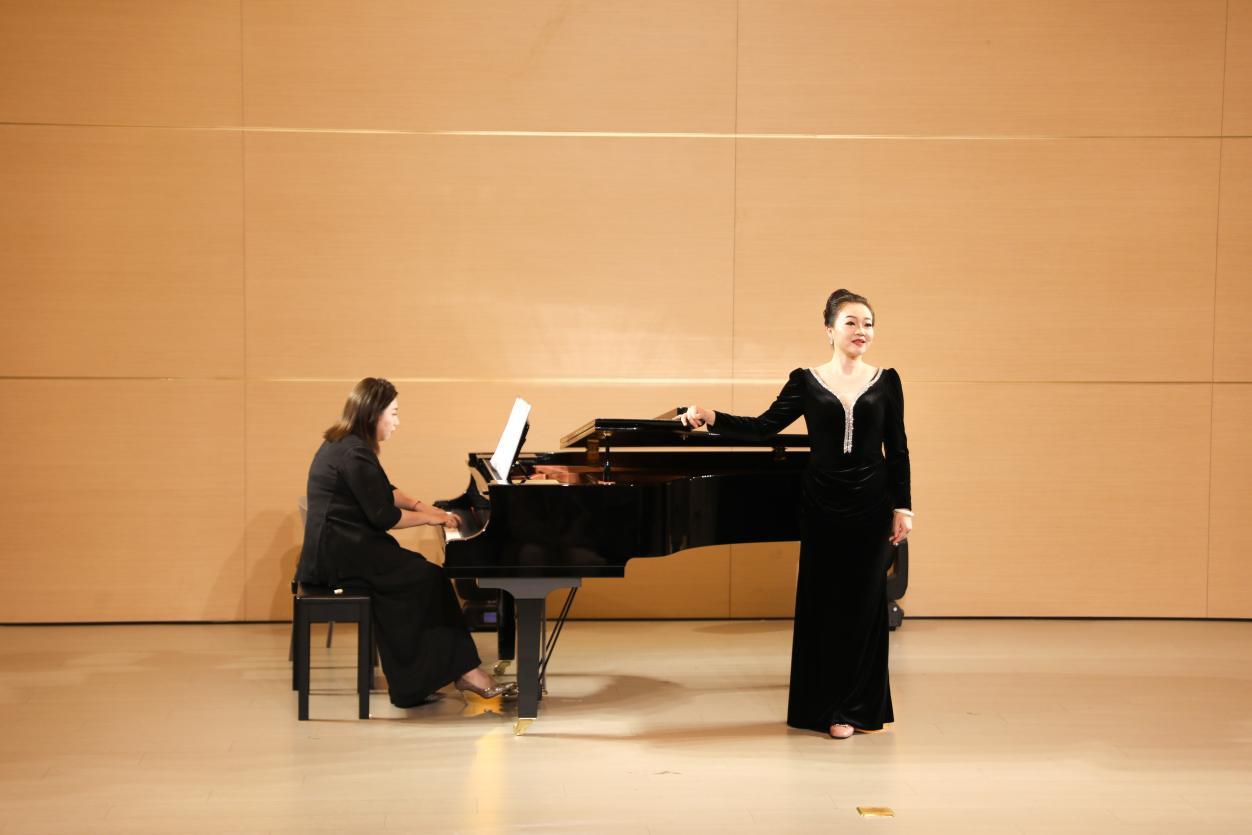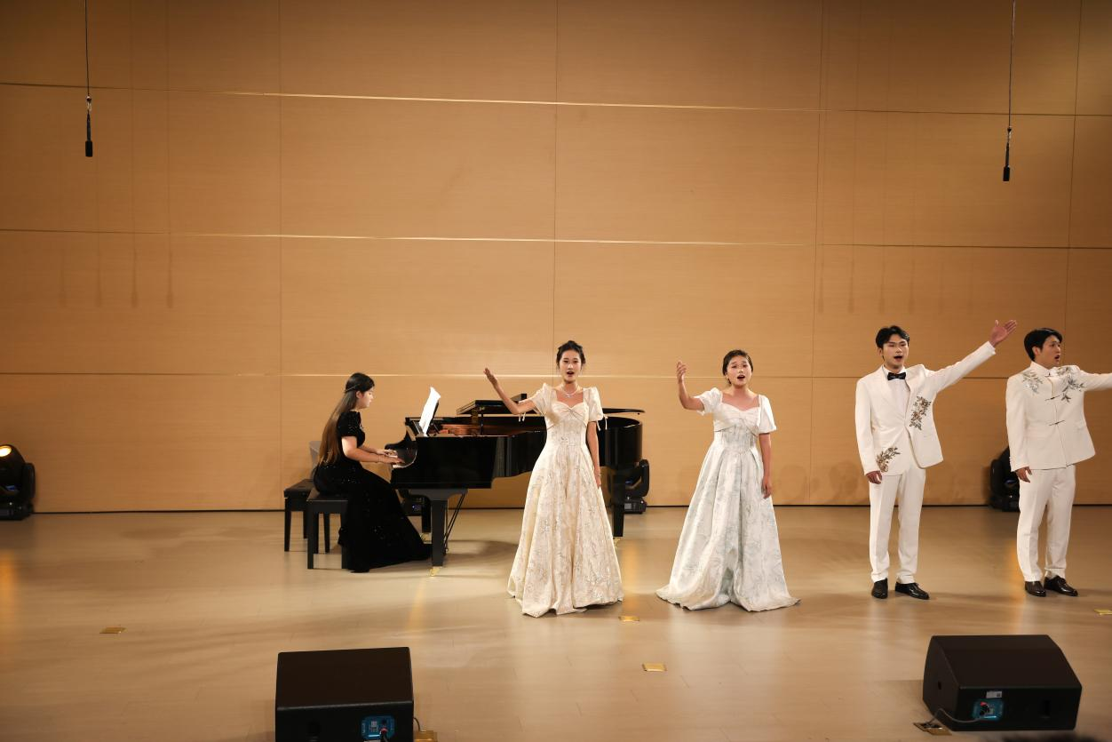 一首意境悠远的艺术歌曲《锦瑟》中拉开音乐会的帷幕,演唱者以醇厚细腻的嗓音,使观众沉浸于静谧而唯美的氛围之中。整场音乐会曲目编排独具匠心,14首精选作品横跨中西、纵贯古今:既有《望乡词》中对家国故土的深切眷恋,也有《彩云追月》的灵动悠扬,仿佛将皎洁月色下的粼粼波光呈现在眼前;《多谢了,朋友们》则以明快活泼的节奏传递出真挚情谊,阿根廷经典曲目《自由探戈》中,钢琴四手联弹的激情碰撞展现出浓郁的异域风情,瞬间点燃现场气氛;而《关雎》以古朴典雅的曲调再现《诗经》的浪漫意境,演唱者的唱腔婉转悠扬,尽显中华传统文化之美。