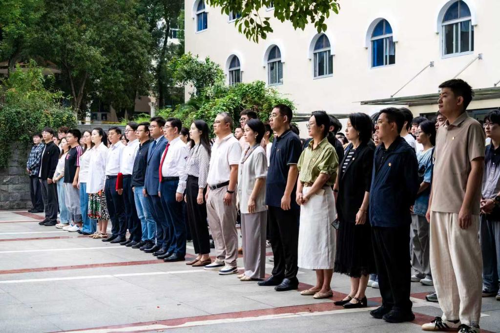 仪式伊始,国旗护卫队护送国旗入场,全场师生肃立行注目礼。伴随激昂的旋律,五星红旗冉冉升起,全体师生齐唱国歌。