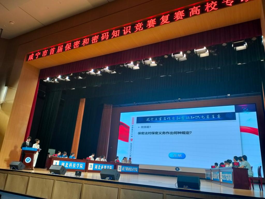 本次竞赛由中共咸宁市委保密和密码工作委员会、市委宣传部、市委直属机关工委、市国家保密局、市密码管理局、市司法局联合主办,湖北科技学院与咸宁广播电视台共同承办。竞赛内容围绕《中华人民共和国保守国家秘密法》《中华人民共和国密码法》等法律法规及实务常识展开,全面检验选手的理论功底与实际应用能力。比赛设置团队必答、个人必答、抢答与风险题等多个环节,综合考察参赛队伍的知识广度、反应速度与协作水平。