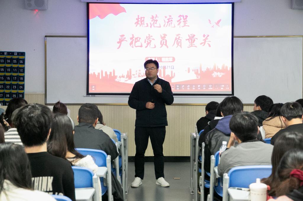 开班典礼结束后,党委常委、副校长程胜军以《规范发展流程,严把党员质量关》为题为学员们讲授了第一堂党课。程胜军结合自身多年党建工作经验,围绕党员发展工作的政治性、规范性和严肃性展开讲解。他从《中国共产党发展党员工作细则》的核心要求出发,系统梳理了党员发展“申请入党——入党积极分子的确定和培养教育——发展对象的确定和考察——预备党员的接收——预备党员的教育、考察和转正”五个关键阶段的具体流程。他强调“党员质量是党的生命线”,要求学员既要在思想上深刻理解党员标准的内涵,也要在行动中以发展对象的身份严格要求自己,主动接受党组织的考察,在学习、工作中发挥先锋模范作用。希望全体培训班的学员牢记习近平总书记的嘱托,要以实现中华民族伟大复兴为己任,增强做中国人的志气、骨气、底气,不负时代,不负韶华,不负党和人民的殷切期望。