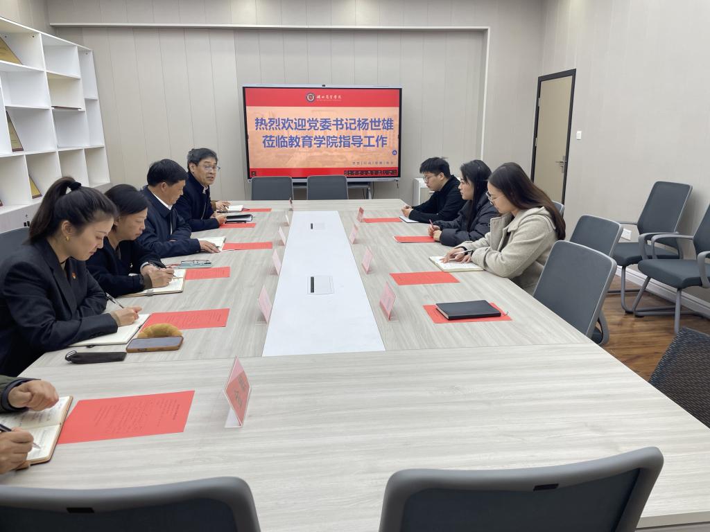 在认真听取汇报后,杨世雄对教育学院成立三年来取得的成绩给予充分肯定。他表示,教育学院办学思路清晰、定位精准,班子团结务实,师生精神面貌积极向上,在党的建设、人才培养、教学改革、社会服务等方面亮点纷呈。