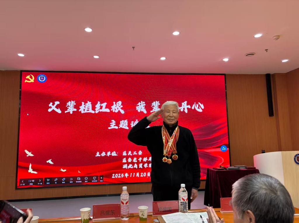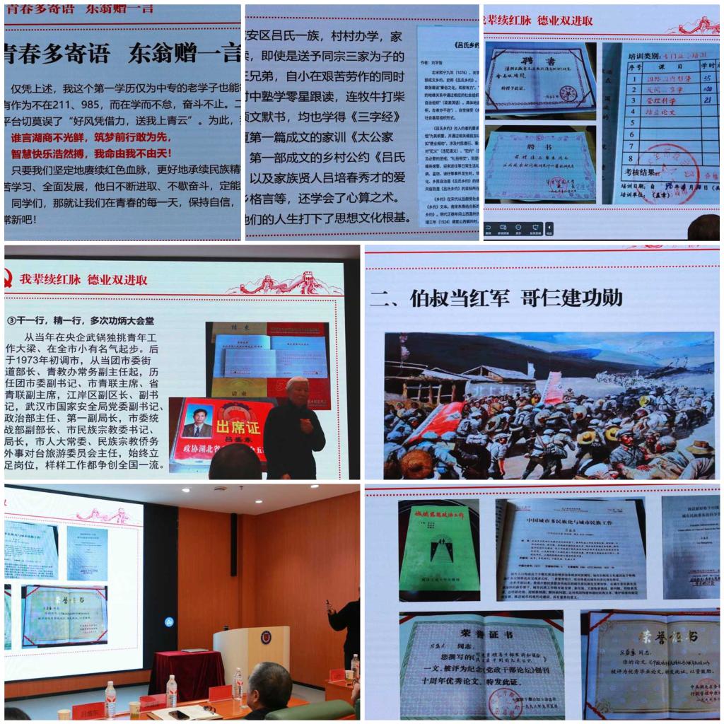 讲座伊始,吕盛东先生以家族故事为“活教材”,将师生带回那段峥嵘岁月:伯父早年参加红三师,在战斗中身负重伤,父亲连夜奔波数十里山路,用竹篼将其抬回隐蔽养伤;小叔吕邦骅1934年参军,1947年在四平战役中壮烈牺牲,父亲每年清明都带全家祭扫,“眼泪怎么也止不住”;1937年,为解决抗日游击队“盐荒”,父亲带领乡亲以芝麻“置换”日商食盐,又冒死翻山送达山区,“人人汗流浃背,赛过一趟马拉松”。父亲为子女取名“东、方、红、太、阳”,带长孙瞻仰向警予烈士墓,将“红根”深植后代心中。