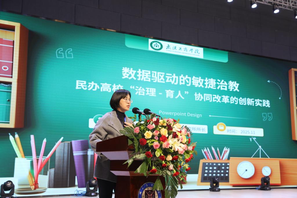 随后,在武昌理工学院党委书记高建勋主持的发展论坛上,华中师范大学、湖北教育数字化研究院副院长钟正,武昌首义学院副校长金鑫,武汉工商学院教授、民办高等教育研究所所长亓小林,以及我校副校长陈靓秋分别作了专题报告,从理论前沿、实践路径和校本探索等多个维度,深度阐释了数字化转型如何赋能民办高校重塑教育生态、实现高质量发展。