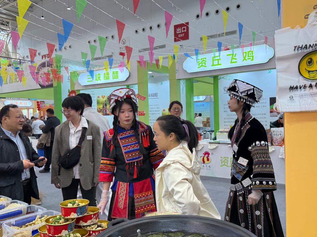 镜头前,电子商务专业学生谭涛身着土家盛装侃侃而谈,将油茶汤的非遗传承故事与高山绿茶、手工炒米的原料优势娓娓道来。面对网友“冲泡是否方便”“是否适合送礼”等提问,他应答自如,用接地气的表达拉近与消费者的距离,直播间互动热度持续攀升。摊位另一侧,学生柯宝玉、魏依伶服务同样细致贴心。“这是省级非遗美食,配料干净健康,老人小孩都能放心喝”“来尝一尝刚冲泡的,土家风味特别醇厚”,两人分工协作,用真诚服务打动每一位参观者,让驻足的人流变成实实在在的消费力。