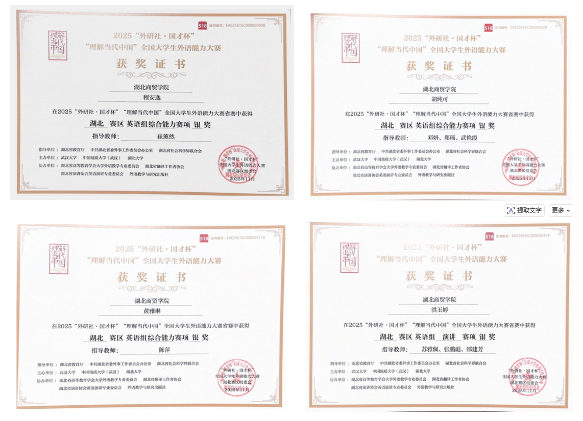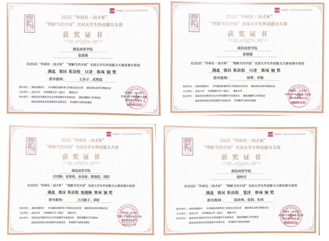 本次大赛竞争激烈。湖北商贸学院参赛团队精心备赛,沉着应战,最终在六个不同赛道中均斩获佳绩,总计获得银奖4项、铜奖4项,获奖数量与质量均位居省内同类院校前列。在体现核心竞争力的综合能力赛道,我校学子表现尤为突出,揽获3项银奖,彰显了学生在语言应用、知识广度与批判性思维等方面的全面优势。英语演讲赛道同样斩获1项银奖,选手以流畅的英语、深刻的见解和富有感染力的表达,生动讲述了当代中国故事。在专业技能要求极高的口译赛道,我校学子沉着冷静,展现了出色的双语转换与即时信息处理能力,成功获得两项铜奖。笔译赛道的选手凭借精准的语言把握和深厚的文化底蕴,获得1项铜奖。此外,在富有创意的短视频赛道,我校团队以独特的视角和精湛的视听语言,创作出展现当代中国风貌的优秀作品,荣获1项铜奖。