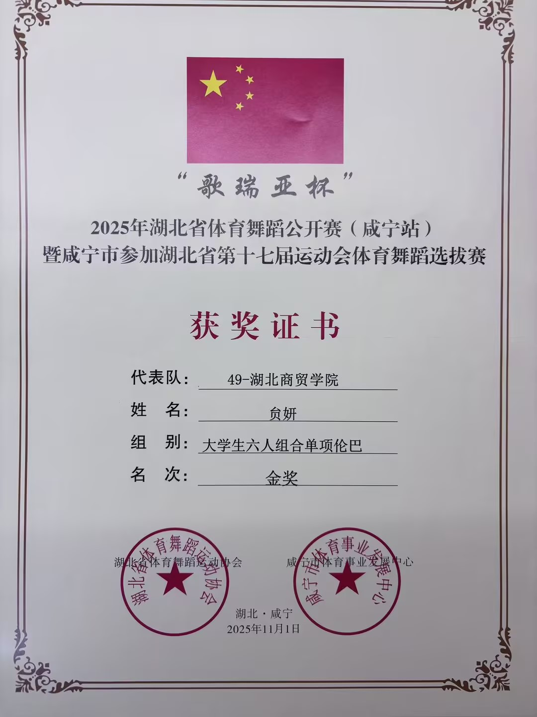 近日,“歌瑞亚杯”2025年湖北省体育舞蹈公开赛(咸宁站)暨咸宁市参加湖北省第十七届运动会体育舞蹈选拔赛在湖北咸宁圆满落幕。城市建设学院学子贠妍表现亮眼,所在团队凭借扎实的功底与默契的配合,一举斩获大学生六人组合单项伦巴金奖、大学生六人组合单项恰恰金奖两项殊荣。