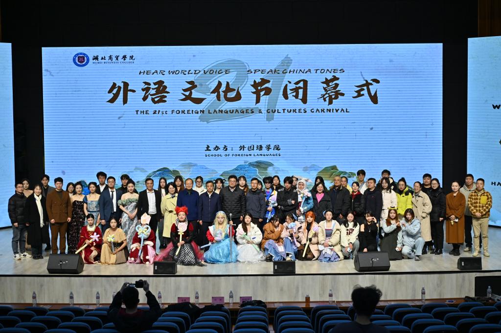 为深化育人成效,助力咸宁校区新生快速融入外语学习氛围、夯实语言实践基础,我校第21届外语文化节系列赛事于11月中旬在咸宁校区正式启动。本次活动覆盖“听、说、读、写、演”全维度外语能力实践,为学子搭建起多元化展示平台。近日,文化节表彰大会暨文艺汇演在咸宁校区文体中心顺利举行,集中呈现活动成果,吸引了1000多名学生现场观看。副校长肖坤、程胜军出席活动,咸宁校区各部门、各学院相关负责人及外国语学院领导班子与千余名师生共享文化盛宴。闭幕式开场环节由外国语学院副院长邵建芳主持。