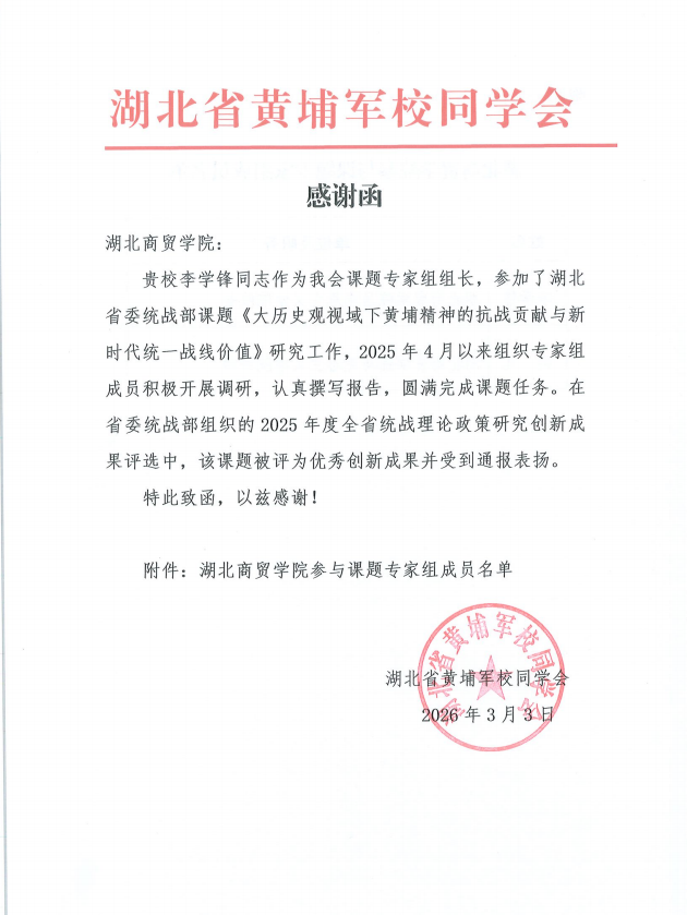 近日,从湖北省黄埔军校同学会传来喜讯,由我校马克思主义学院院长李学锋担任课题专家组组长,与吴凡老师共同参与研究的湖北省委统战部课题《大历史观视域下黄埔精神的抗战贡献与新时代统一战线价值》获评2025年度全省统战理论政策研究优秀创新成果,受到通报表扬。