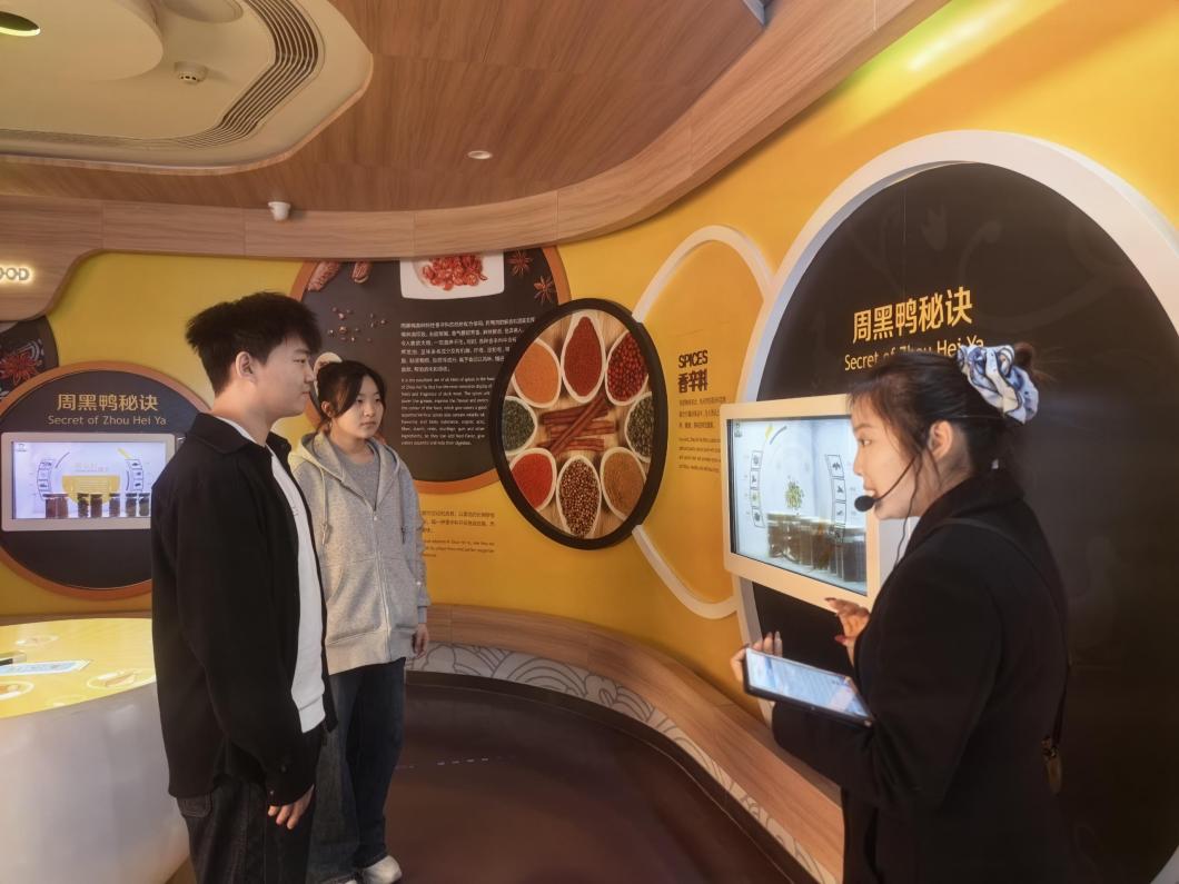 陈靓秋一行首先参观了周黑鸭企业文化展厅和智能化生产车间。通过实地考察和详细讲解,深入了解了周黑鸭从街头小摊发展成为上市企业的历程、独特的企业文化以及全产业链布局。特别是在数字化管理方面,代表团对周黑鸭在供应链追溯、智能仓储、营销数据分析等环节的信息化建设成果印象深刻。
