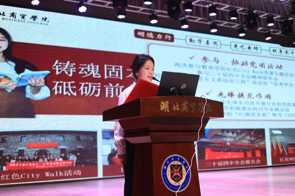 在宣讲环节,六位宣讲团代表依次登台分享成长感悟、传递榜样力量,展现青春风采,赢得现场阵阵热烈掌声。教育学院2023级小教本七班陈佳鑫以“破茧添翼 逐光越己”为主题,讲述了自己在求学路上突破自我、迎难而上的成长历程,真挚的情感与朴实的表达打动了在场每一位师生。