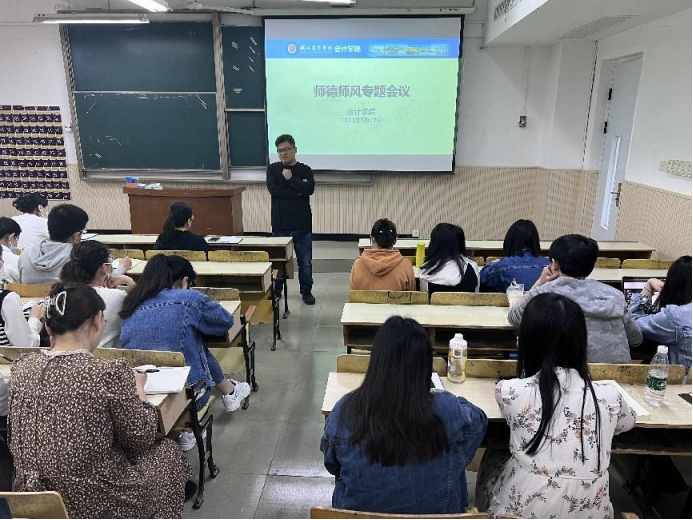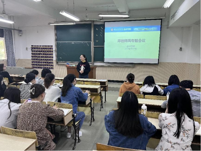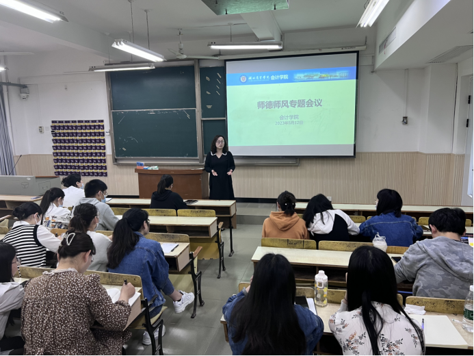 5月12日上午,会计学院在综合楼B-201教室召开了新晋教师“师德师风专题会议”。会议由会计学院院长吕碧君主持、会计学院书记赵忠民、副院长郑晓燕进行专题讲话。本次会议主要对近期师德师风相关事件进行通报,并针对第13周开课的新老师师德师风提出要求。本次会议采用线上和线下相结合的方式,咸宁校区教职工通过企业微信参加会议。