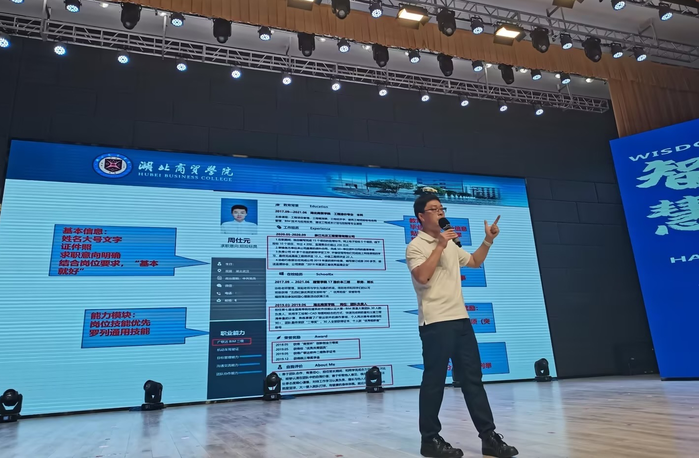 5月25日晚,我校2023年第三期“就业指导进校园”巡讲活动在文体中心大礼堂举办。本期讲座由管理学院刘青老师带来题为《历历在目,面目一新》的简历与面试辅导讲座。招生与就业指导处副处长詹卓、学生工作处副处长钱清香、人工智能学院党总支副书记刘红春、外语外事学院党总支副书记廖艳霞出席活动。校团委副书记徐辉主持活动。