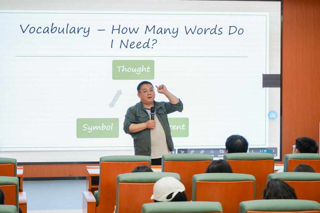 余昊从英语应用面引入,围绕词汇、语法、听、说、读和写等方面,通过介绍陈寅恪、辜鸿鸣、赵元任和钱钟书等人物的故事,让同学们更加深刻的了解“文化自信”的内涵。同时,还深入浅出地让同学们理解学习英语的意义何在,并传授英语学习方法和技巧。现场气氛热烈,同学们积极参与互动。