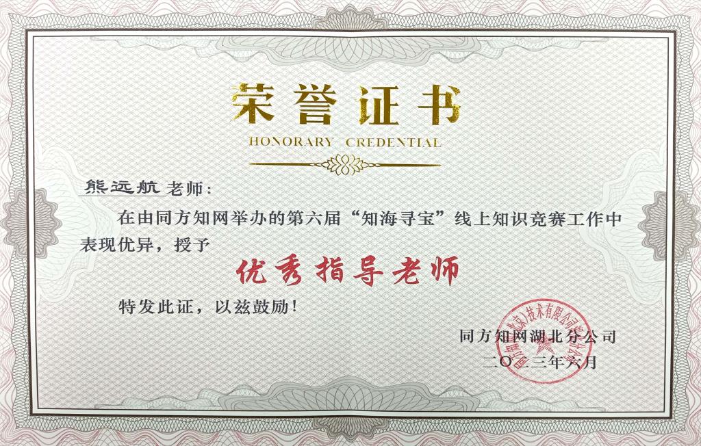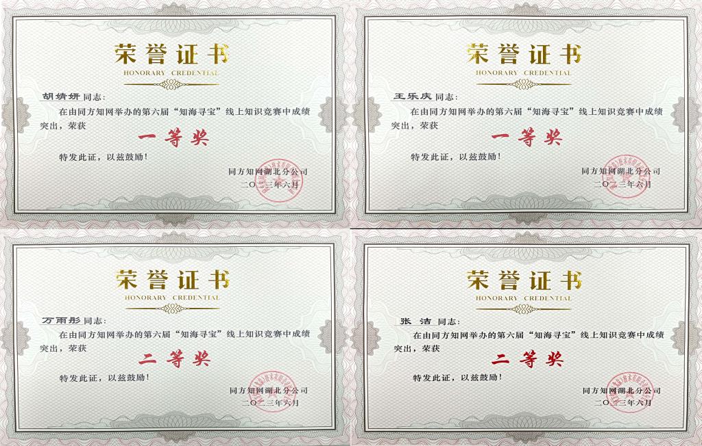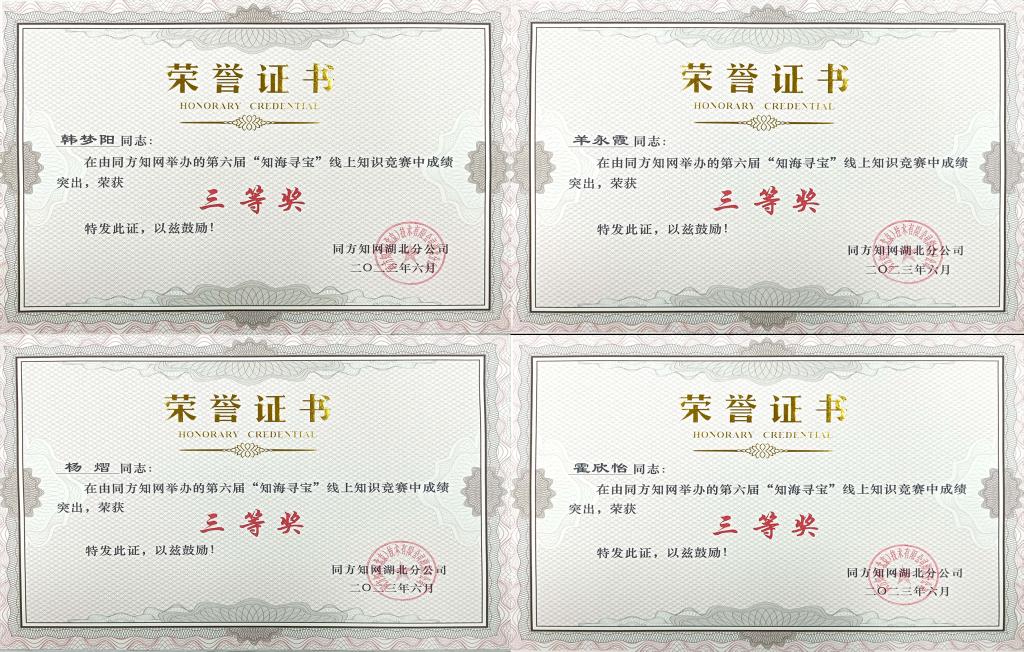 近日,由中国知网湖北分公司主办的湖北省第六届“知海寻宝”线上知识竞赛活动,公布了获奖结果,我校8名学生从比赛中脱颖而出,其中,2022级会计本2班胡婧妍、2022级小教本4班王乐庆分别以全省第六名和第十五名的成绩荣获一等奖;2022级翻译本2班万雨彤、2022级小教本8班张洁荣获二等奖;22级会计本4班羊永霞、2021级会计本1班杨熠、2022级学前专4班霍欣怡、2021级学前专1班韩梦阳荣获三等奖,图书馆熊远航荣获优秀指导老师,图书馆荣获优秀组织奖。