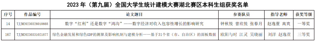 本次大赛的主题为“中国式现代化的统计测度”,全国共有734所院校21992支队伍报名参赛,在湖北赛区竞赛中我校三支分别由经济学院赵逸萱、高爽、刘洋三位老师指导的队伍,历经三个月精心准备、打磨,最终赵逸萱、高爽老师指导的钟秋悦、曾欣悦、张春月学生团队论文《数字“红利”还是数字“鸿沟”——数字经济对收入包容性增长的影响研究》荣获湖北省本科生组一等奖,由刘洋、赵逸萱老师指导欧阳与时、江灵、吴晓丽同学的论文《绿色金融发展和绿色GDP的测算及影响机制与建模分析》荣获湖北省本科生组三等奖。
