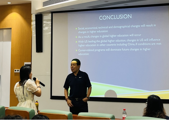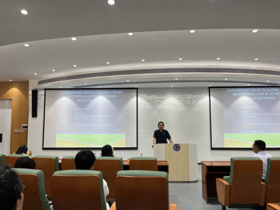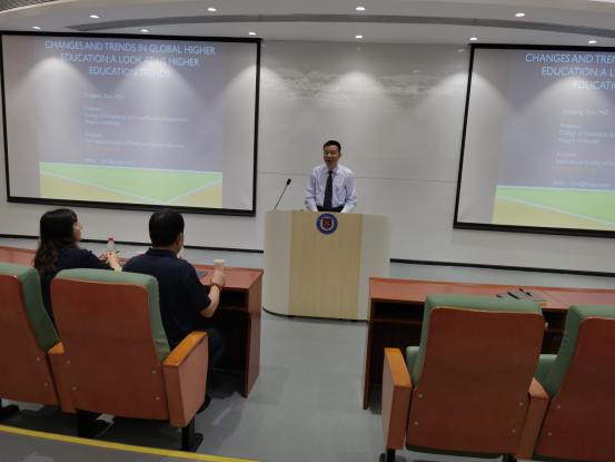 周教授提出随着社会、经济、技术和人口的变化,当前美国高等教育正面临很多变革,大学与社会深度融合的需求越来越强烈,未来高等教育高质量发展的关键是科教一体,产业融合,在人才培养、专业设置、课程设置方面要紧紧围绕时代发展同频共振。他以美国尼亚加拉大学旅游与酒店管理学院为例,为了适应时代发展进步,新增设了智慧旅游专业,该专业是信息技术在旅游产业中的创新性应用,为了拓宽学生的视野和知识面,在课程设计方面该专业还新增了商业类课程、体育类课程、拓宽职业选择的服务相关课程。