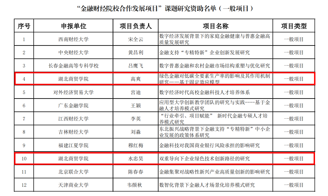 近日,中国金融教育发展基金会发布2023年“金融财经院校合作发展项目”我校研究项目资助立项结果。经济学院高爽老师申报的《绿色金融对低碳全要素生产率的影响及其作用机制研究——基于固定效应模型》,水忠昊老师申报的《双重导向下企业绿色技术创新路径的研究》分别获批一般项目,经费资助8万元。