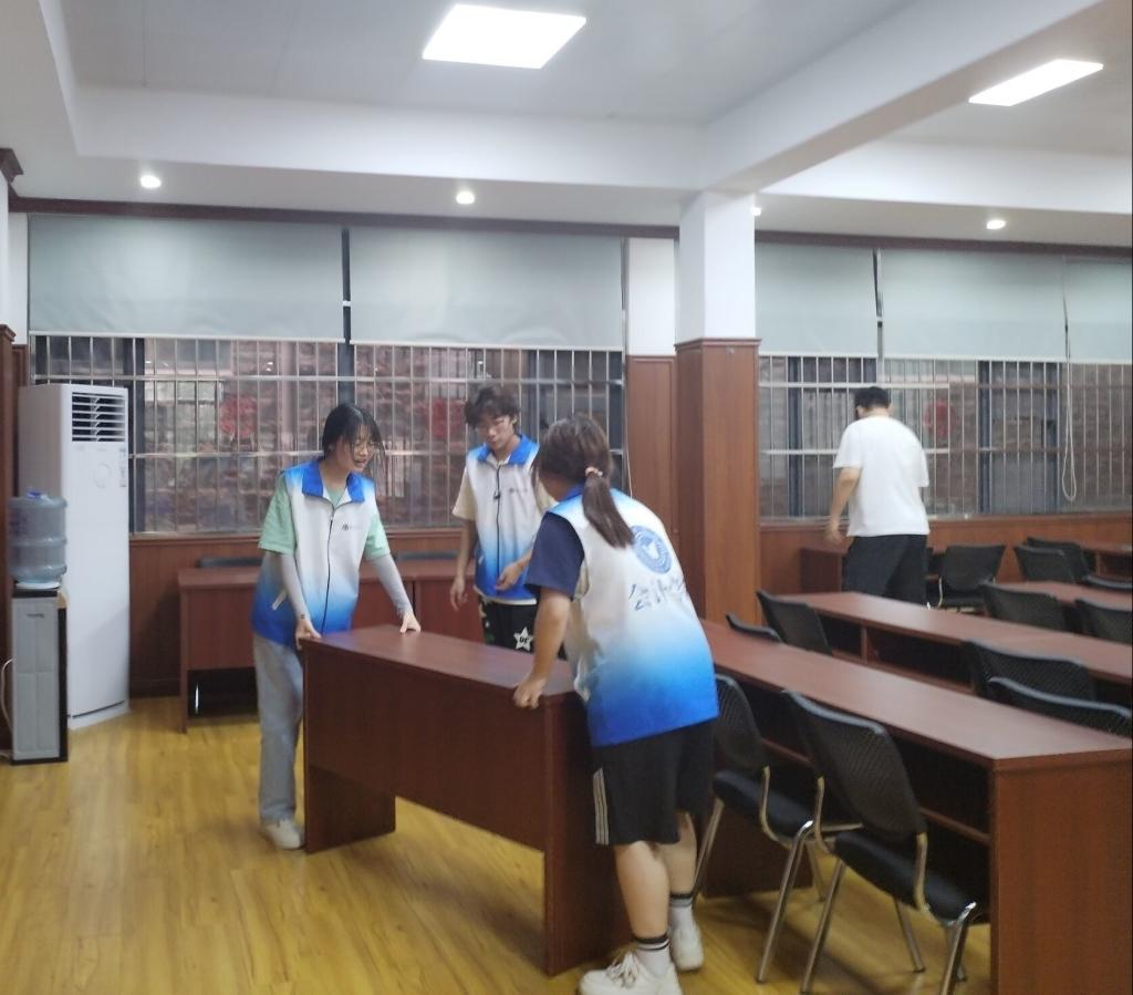 开班仪式之前,志愿队全体同学早早地来到社区,布置教室场地、整理阅览室书籍,并接待报名参加活动的社区儿童及家长,做好儿童信息登记和与家长接洽工作。
