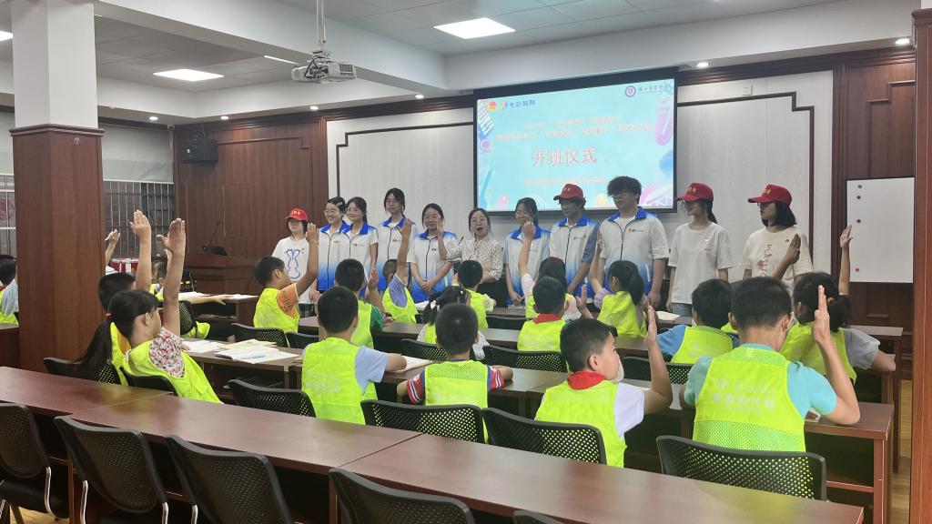 7月4日,湖北商贸学院逐梦星辰志愿队前往南湖锦城社区举行2023年“七彩假期”志愿服务暨“为爱启航,伴我童行”阳光行动开班仪式,关东街道公共管理办科长闫磊、关东街道团工委副书记许宁、南湖锦城社区副主任孙刚、铁箕山派出所民警万吕、会计学院学生三支部书记刘生思、志愿队全体成员、部分社区儿童及家长参加了本次活动。在开班仪式上,刘生思老师介绍了逐梦星辰志愿队及“七彩假期”志愿服务支教活动,本活动包括趣味课堂、作业辅导、阅读引导、暑期陪伴等服务。孙刚主任鼓励社区儿童积极参加,并表示会全力做好安全工作和后勤保障。