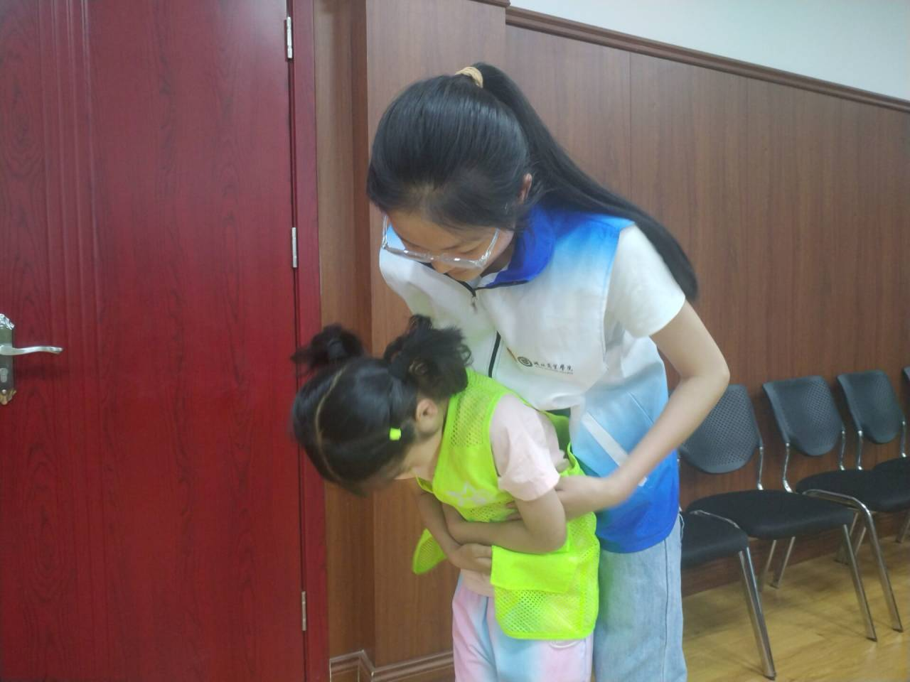 “如果遇到了食物噎住喉咙,导致呼吸困难,我们应该怎么办呢?”带着这一疑问,张启悦告诉孩子们,吃东西的时候一定要注意坐姿端正、不能嬉闹说笑,万一遇到了食物噎住喉咙的情况,可以运用海姆立克急救法来对他人进行救援或者自救。于是,志愿者罗鹏月通过情景演绎的方式,形象地展示出海姆立克急救法的三种救援方式,并邀请小朋友共同操练。