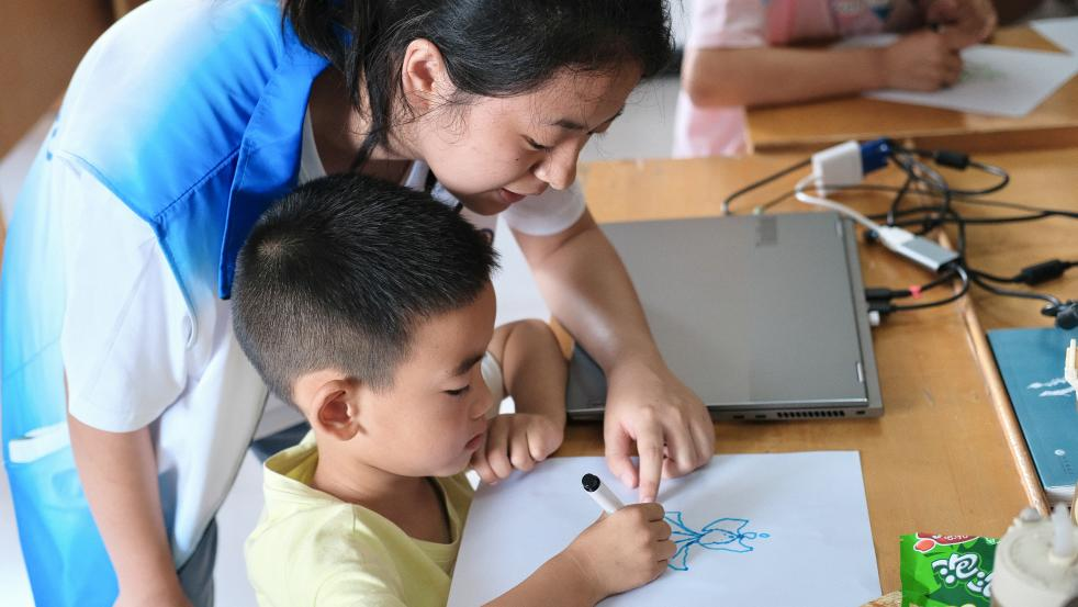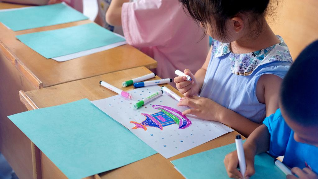 铭心志愿队队员王松君带来的课程《了不起的黄鹤楼》,带领孩子们用画笔激发想象的翅膀,绘出“各色各样”的黄鹤楼,引导孩子们在小小的课堂里体验中华文化的博大精深。
