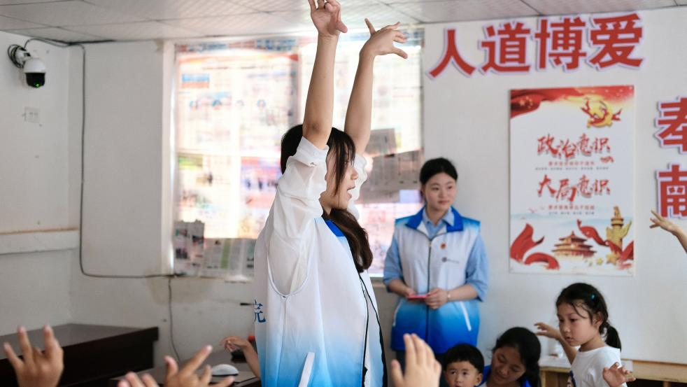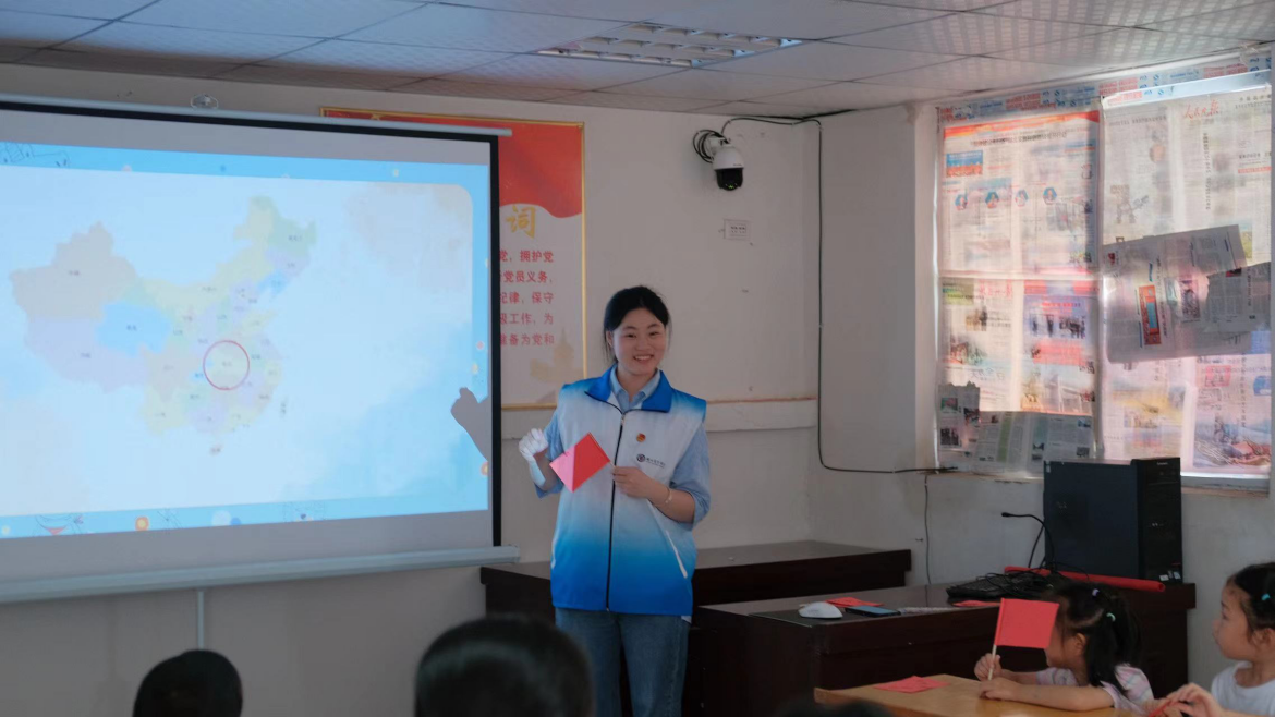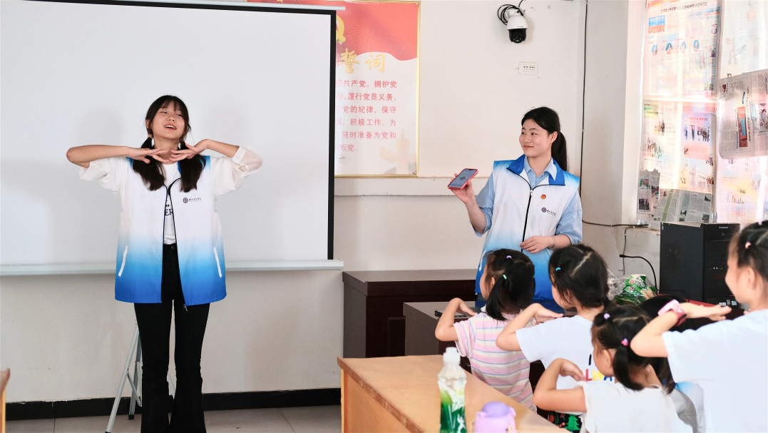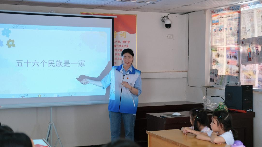 “小朋友们,有谁知道中国有多少个民族?”“56个!”铭心志愿队队员林静茹、陈怡玲带来的课程《民族之花处处开》在孩子们响亮的回答声中推向高潮。课堂上,林静茹带领孩子们领略“山水甲天下,山歌传四方”的壮族、“白山黑水出勇士”的满族、“把沙漠变绿洲”的维吾尔族,“草原的儿女”蒙古族......通过展示各个民族的舞蹈动作,带领孩子们一起跳一起唱,浇灌孩子们心中小小的“团结之花”,让祖国民族团结进步之花长盛不衰。