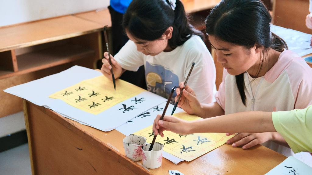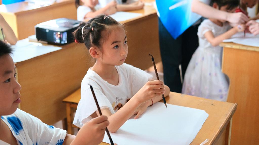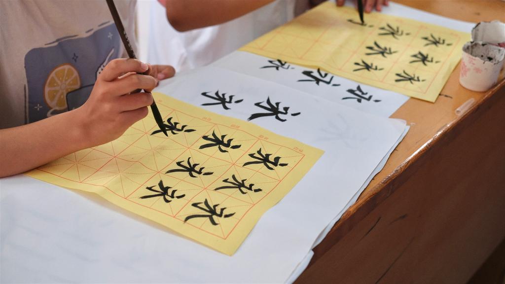 讲完汉字的演变,铭心志愿队队员陈怡玲为孩子们带来一堂生动的书法课。课上,她从练习书法时的“三平”坐姿和执笔时的“捏、钩、抵”教起,悉心讲解了“文房四宝”与“永字八法”,带领孩子们一起学练书法,学写“永”字。很多孩子都是第一次接触书法,练习时,一笔一画写得格外认真,教室里翰墨飘香。陈怡玲在课程结束后说:“孩子们学得很认真,我把毛笔送给了孩子们,希望他们能继续练习,多一个课余爱好,多感受中华传统文化的魅力。”