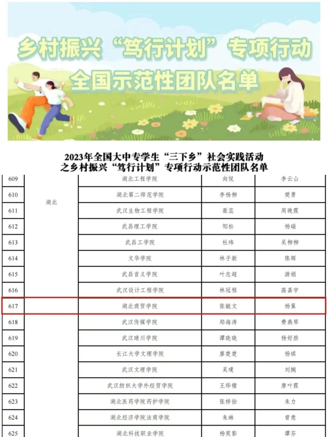 根据《关于开展2023年全国大中专学生志愿者暑期文化科技卫生“三下乡”社会实践活动的通知》有关要求,共青团中央青年发展部近日决定在全国范围内组织开展2023年全国大中专学生“三下乡”社会实践活动之乡村振兴“笃行计划”专项行动。经学生自愿报名、学校团委推荐、省级团委遴选、团中央青年发展部审核,最终选出1000支全国性示范实践团队。我校艺术与传媒学院 “故作乡村”暑期三下乡社会实践服务队荣誉入选乡村振兴“笃行计划”专项行动全国示范性团队。