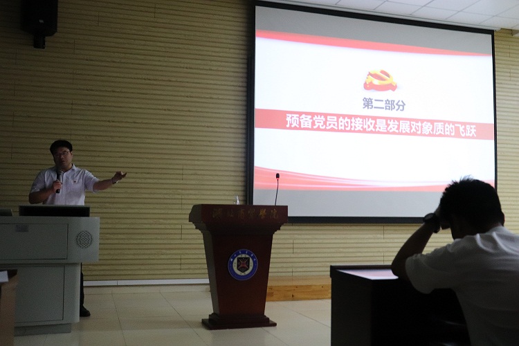 开班典礼结束后,学校党委常委、党务工作部部长程胜军以《十年磨一剑,一朝试锋芒——发展对象到预备党员,人生的关键期 》为题为学员们讲授了第一次党课。他从确定为发展对象是入党积极分子的华丽转身;预备党员的接收是发展对象质的飞跃;习近平总书记论如何做一名合格党员以及学习贯彻习近平总书记在庆祝中国共产党成立一百周年上的重要讲话四个方面进行了讲述,并提出三点要求:一要严格按照学校要求完成学习培训任务,使自己的思想得到提升、党性得到淬炼;二要坚持政治标准,严守政治底线,践行初心使命,勇担时代重任;三要身体力行,争先创优,积极主动作为,在日常的学习、生活、工作等方面发挥表率引领作用。最后他引用习近平总书记的讲话,希望全体培训班的学员,要以实现中华民族伟大复兴为己任,增强做中国人的志气、骨气、底气,不负时代,不负韶华,不负党和人民的殷切期望。