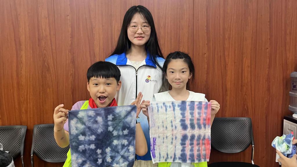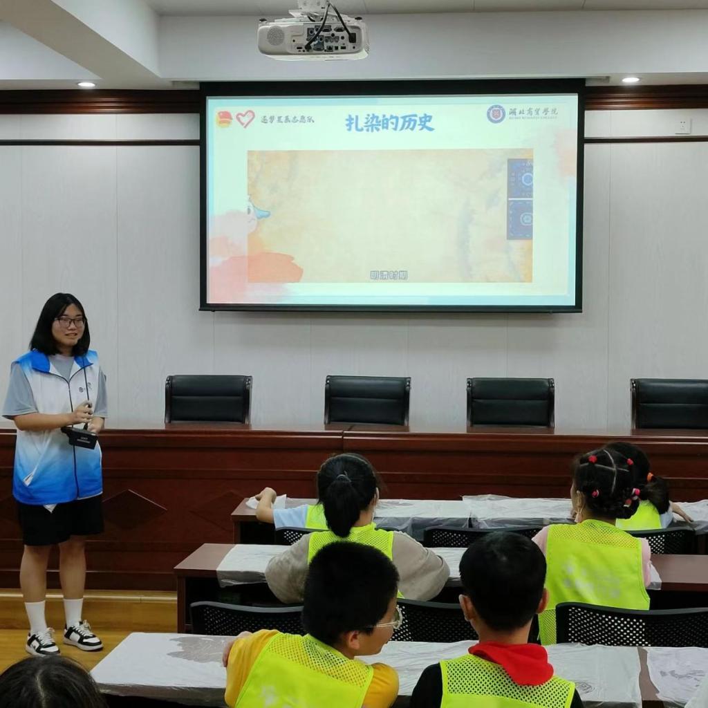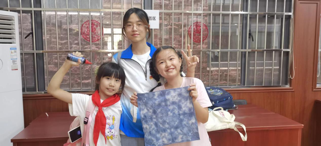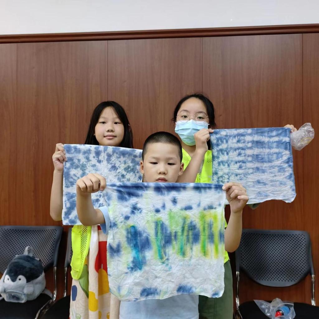 扎染是中国少数民族一种独具特色的手工染色技艺,作为国家级非物质文化遗产,扎染工艺的历史悠久,且深深植根于民间。7月12日,会计学院逐梦星辰志愿队在南湖锦城社区开展了“趣味扎染,布里生花”扎染制作课堂。志愿者沈佳园向孩子们详细科普了扎染的历史、种类、特点及用途,并详细介绍了困扎法、缝扎法、夹板法这三种常见的扎染方法,这都无不体现出劳动人民的勤劳和智慧。
