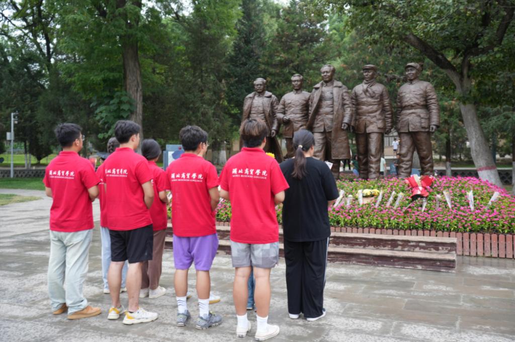 队伍继续向前行进,进入领导人居住区前,可以看到当时中央五大书记在一起昂首阔步的铜像,雕刻得惟妙惟肖。站在伟人的铜像面前,实践队员们肃然起敬,指导老师宋杰老师带领实践团队向革命先辈的铜像献上鲜花并鞠躬,以此致敬革命先辈们的无私奉献。