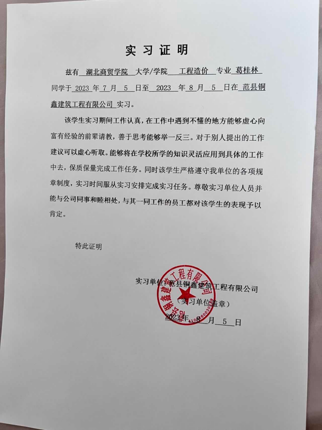 葛桂林同学实习证明