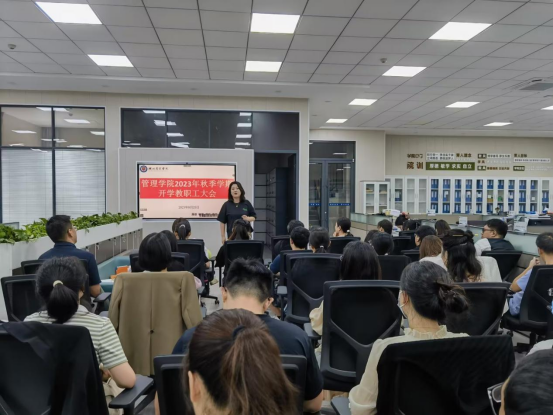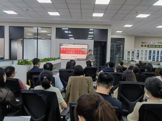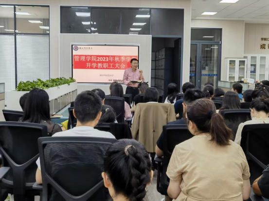 为迎接学校合格评估,持续开展好新学期各项重点工作,8月25日下午,管理学院召开2023年秋季学期开学教职工大会。管理学院院长严良、党总支书记王珉、副院长徐刚、副院长孟静、咸宁校区党总支副书记王胜以及全院教师参加了本次会议,会议由王珉主持。