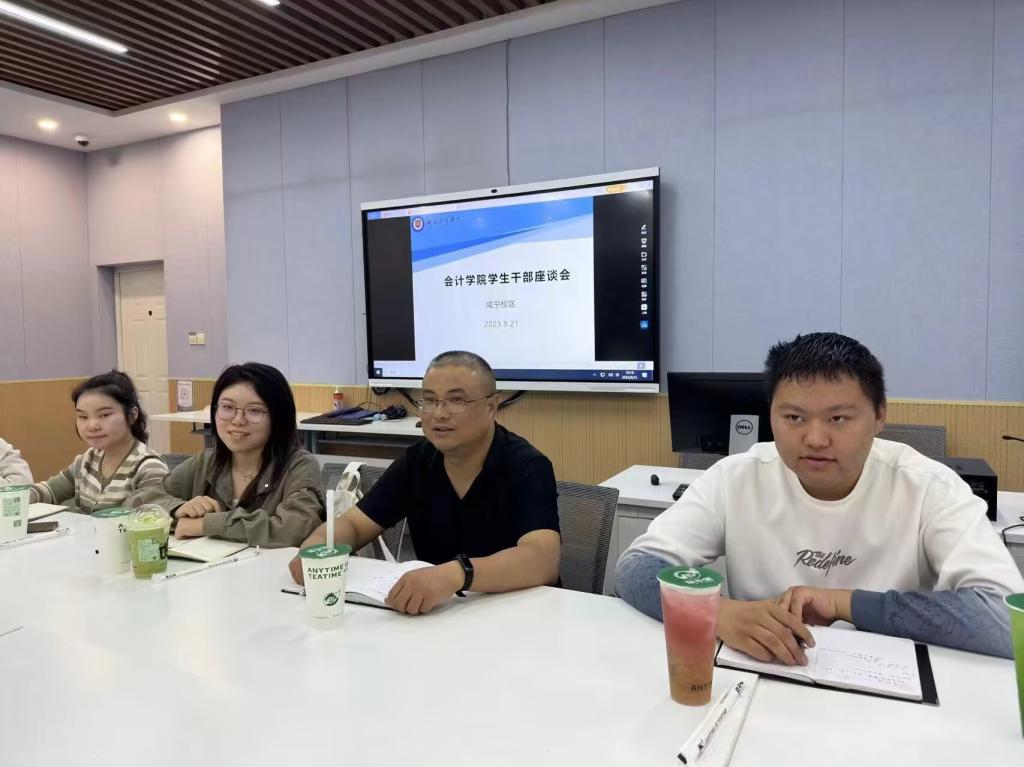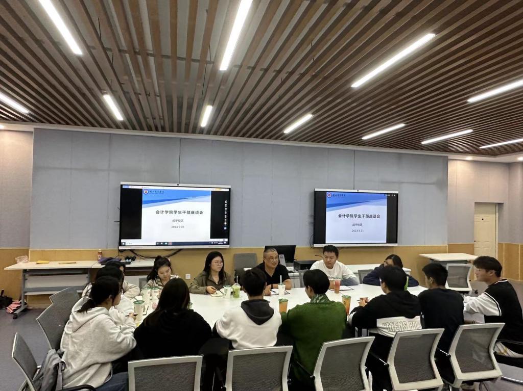 9月21日晚上,会计学院在咸宁校区召开团委、学生会干部座谈会,了解学生在校期间思想动态和学习生活状况,收集学生对教学、管理、服务等方面的意见和建议。通过和学生面对面对话、现场回答的方式,解答同学们提出的实际问题,帮助解决实际困难。会计学院党总支副书记詹卓及辅导员代表作为嘉宾参加座谈会。