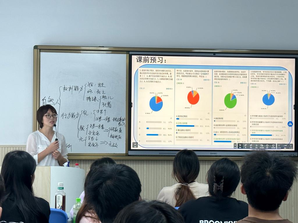 活动中,邓相花教授为22财管本1班讲授《民法》课程。,她的课堂教学注重理论与实践的结合,通过丰富的案例分析和互动讨论,使学生们能够更好地应用理论知识解决实际问题。她将复杂的民事主体理论以通俗易懂的语言呈现给学生们,引导学生深入理解民事主体的概念、分类和法律属性。课堂上,学生们积极参与讨论,与邓相花教授进行了一场思维碰撞和学术交流。在示范课后,邓相花教授还与新老师们分享了一些授课方法和心得体会。