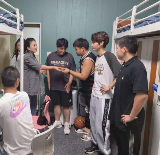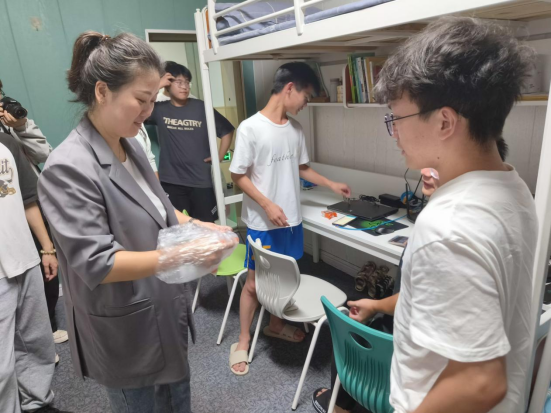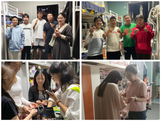 王珉和辅导们敲开学子的门扉,收到月饼的同学们十分欣喜。23数管本1班裴晨曦说到,“看到王珉书记、刘淞老师和杨雪滢老师拿着月饼送到我们的手上,我们很意外,同时也惊喜于学院有这样充满人文关怀的活动。”