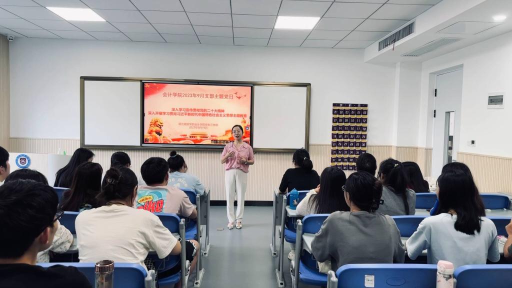 9月19日,会计学院学生三支部于2-203开展九月支部主题党日活动。本次活动会计学院学生三支部全体成员参与。该次主题为“深入学习宣传贯彻党的二十大精神,深入开展学习贯彻习近平新时代中国特色社会主义思想主题教育”。会议按照规定程序,由书记刘生思主持通报参会党员情况及党费缴纳情况、奏唱国歌、集体重温入党誓词并诵读党章。