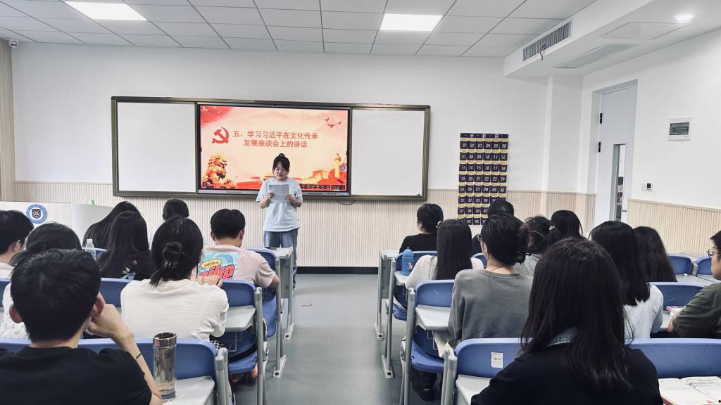 罗雪怡同学与大家一起学习习近平总书记在文化传承发展座谈会上的讲话。大家表示,要以习近平总书记的重要讲话精神为指引,站在新的历史起点上,担负起新的文化使命,坚定文化自信自强,努力推进中华民族现代文明和社会主义文化强国建设。
