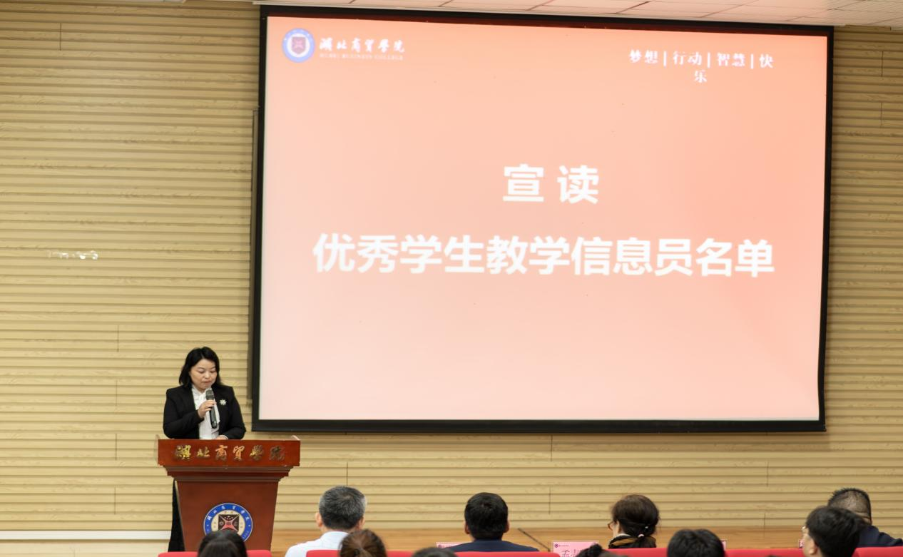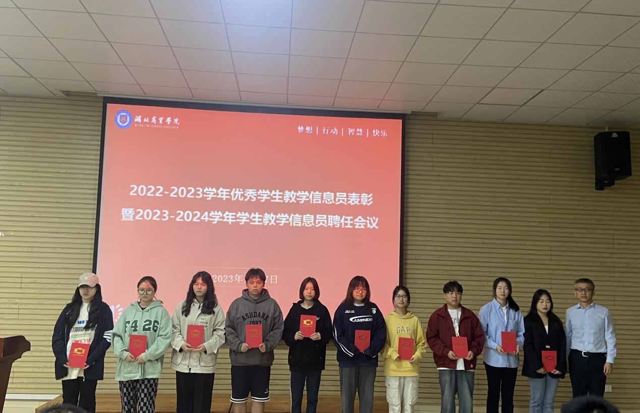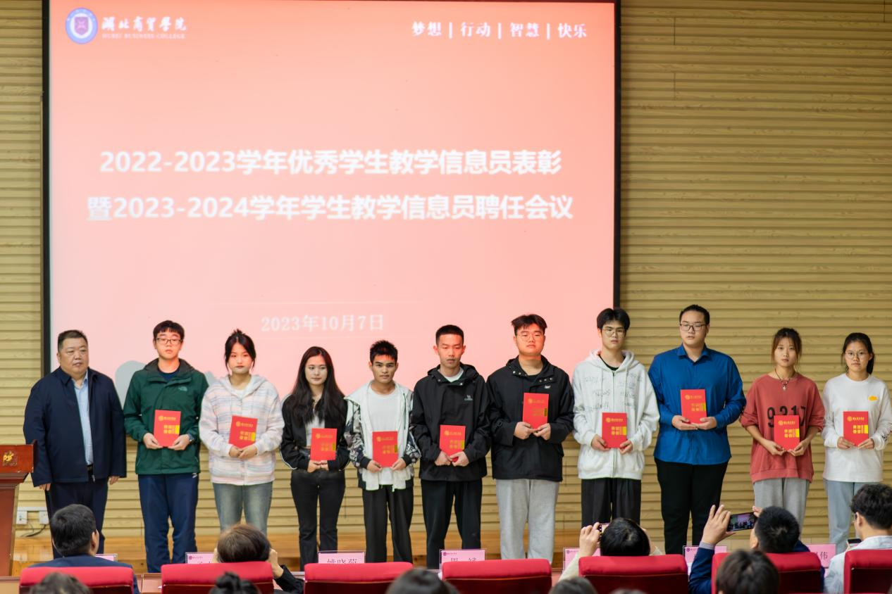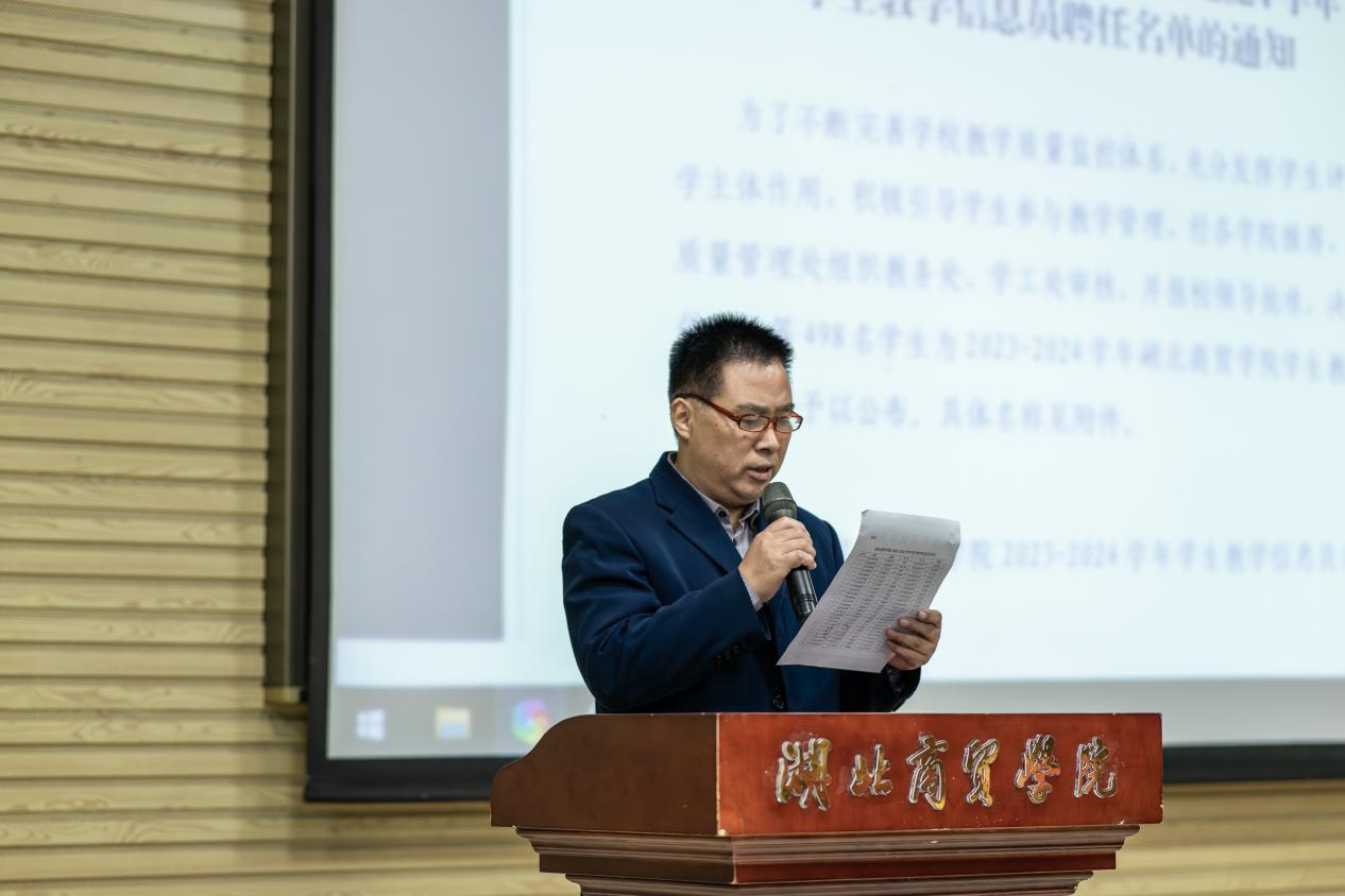 会上,姚晓菊宣读了《关于公布湖北商贸学院2022-2023学年优秀学生教学信息员名单的通知》,吴嘉俊等34名学生被评为优秀学生教学信息员。咸宁校区校级教学督导员杨清平教授宣读了《关于公布湖北商贸学院2023-2024学年学生教学信息员聘任名单的通知》,王鑫怡等180名学生被聘为学生教学信息员。周斌为优秀学生教学信息员代表颁发荣誉证书,教学质量管理处副处长肖大群为学生教学信息员代表颁发聘书。