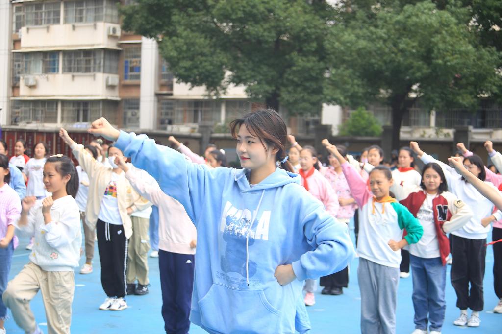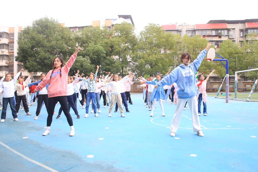 10月8日,体育学院直属党支部书记何婷、体育教育教研室主任汤洋、健美操队教练宋佳敏以及分团委书记韩夏带领“一言一行”志愿服务队走进卓刀泉小学,开展“关爱青少年成长 健身操进校园”志愿服务活动。