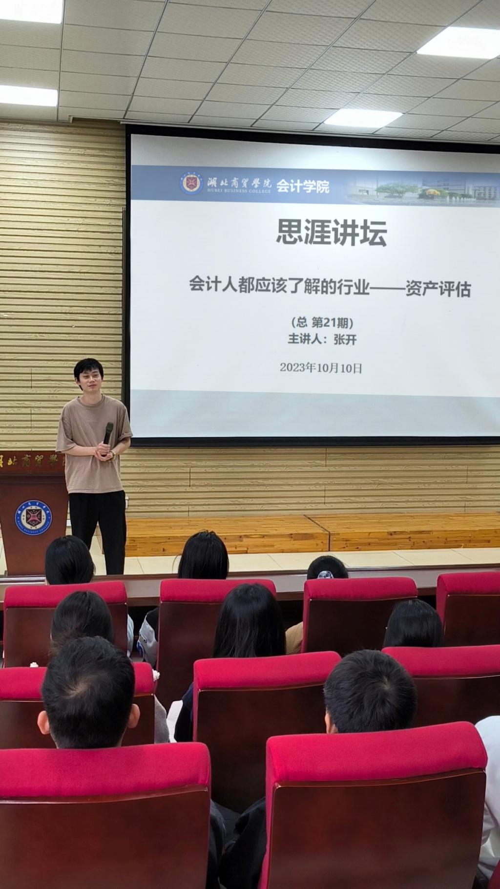 为帮助同学们解决求职、求学中的遇到的问题,近日,会计学院在咸宁校区为会计学院学生举办了第二十一期思涯讲坛,主题为“会计人都应该了解的行业——资产评估”。本次讲座由会计学院张开老师主讲,23级会计专1-3班的学生参加。