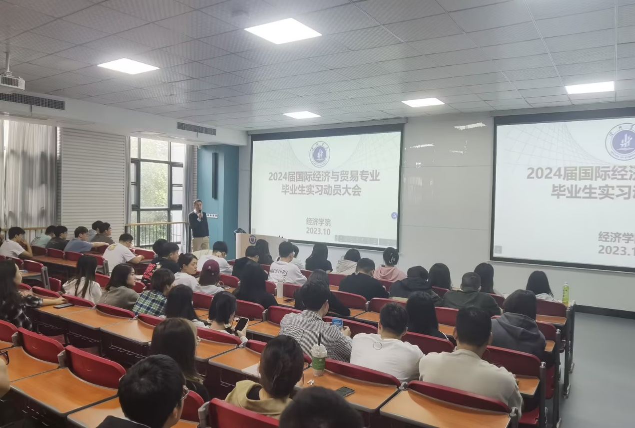 为全面做好我院2024届毕业生毕业实习工作,贯彻落实学校高质量就业要求,10月13日,经济学院在武汉校区召开了2024届国际经济与贸易专业毕业生实习动员大会。本次动员大会由国际经济与贸易教研室主任刘皓老师主持,2024届国际经济与贸易专业本1、本2、B1班级全体学生参加了动员会。