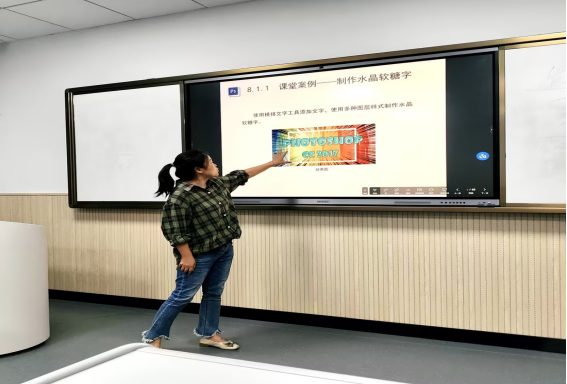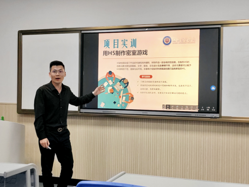 王雪君老师和汪杰敏老师分别分享了《Photoshop平面设计A》和《H5设计与制作》课程,为学生展示了图像处理实操和用H5制作密室游戏的实训技能。