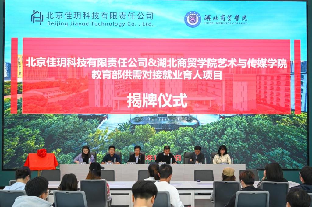 在校企双方的见证下,北京佳玥科技有限公司CEO孙浩与艺术与传媒学院院长薛果共同为“教育部供需对接就业育人项目基地”揭牌。