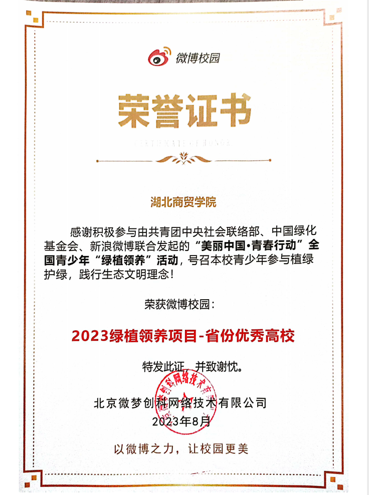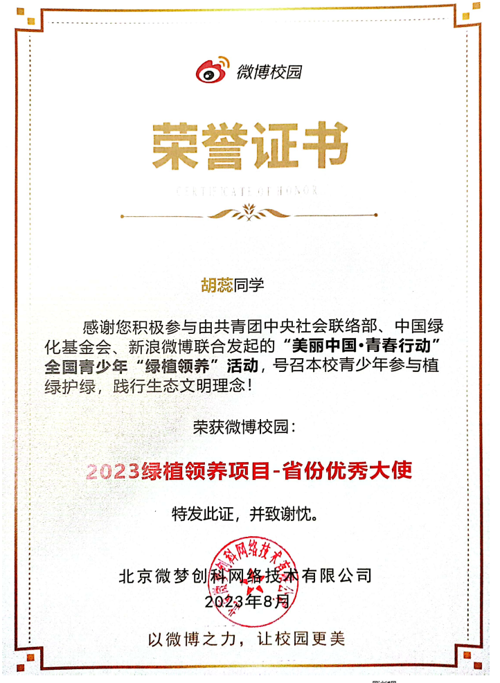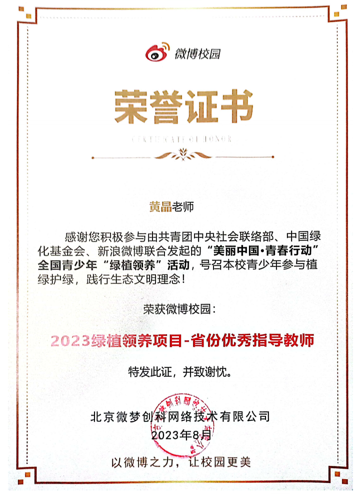 此次活动在我校团委的悉心指导以及同学们的热情参与下,荣获多项荣誉。我校荣获“2023绿植领养项目-省份优秀高校”,校团委黄晶老师荣获“2023绿植领养项目-省份优秀指导教师”称号;胡蕊同学荣获“2023绿植领养项目-省份优秀大使”称号。