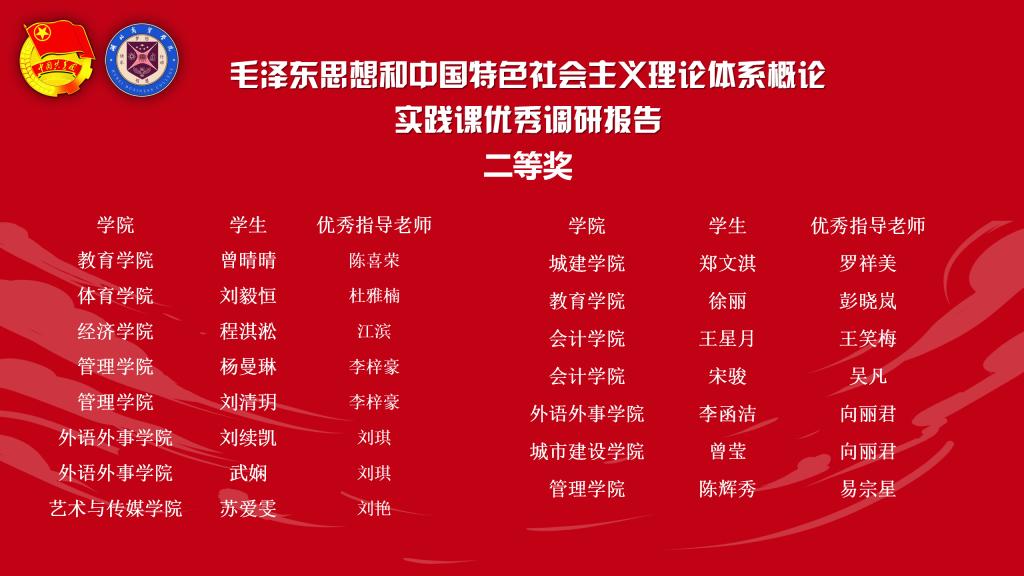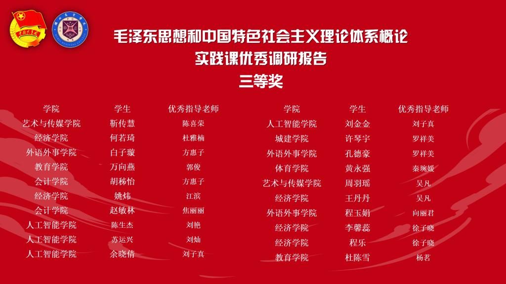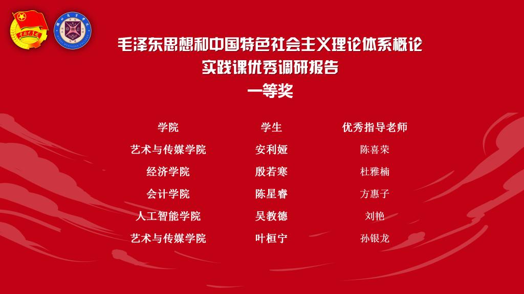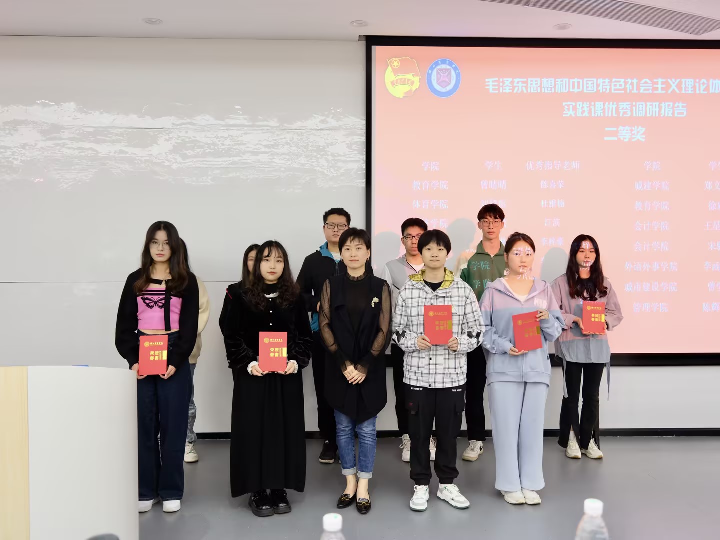根据教育部关于印发《新时代高校思想政治理论课教学工作基本要求》的通知等文件要求,从本科思想政治理论课现有学分中划出2个学分,开展思想政治理论课实践教学。10月19日,马克思主义学院在鸿博楼阶梯教室一举办第一届“毛泽东思想和中国特色社会主义理论体系概论”实践课优秀调研报告颁奖典礼,经济学院党总支书记吴俊、人工智能学院党总支刘冰清和教育学院直属党总支书记郑洁、马克思主义学院院长孔波、副院长陈泽华和副院长金敏出席此次活动。