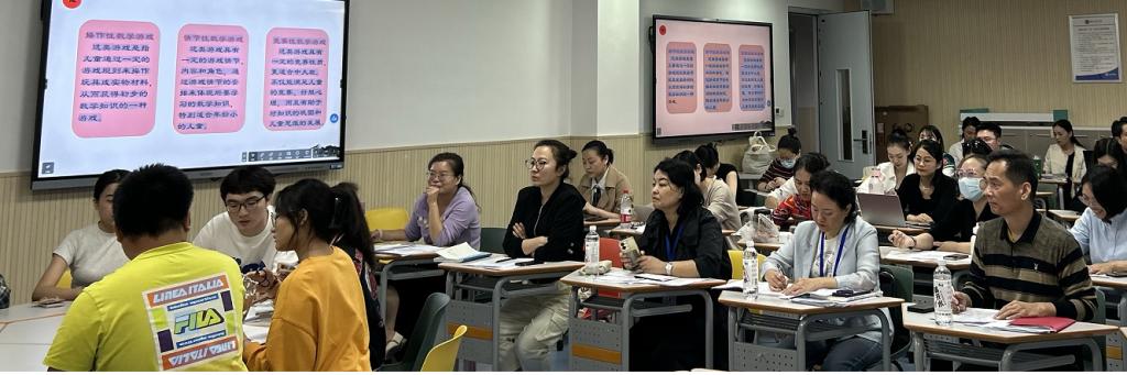姜莉老师展示的是《学前儿童数学游戏的设计与指导》,通过“中国古代数学知多少”导入课程,从九章算术谈到圆周率、勾股定理,并通过有趣的传统数学玩具角色扮演活动引导学生充分感知传统数学文化的魅力,提升文化自信,增强文化责任感。接下来,姜老师带领学生回顾常见的三种数学游戏类型,并引导学生分组讨论设计数学游戏,充分体现学生的主体性,学生积极踊跃地参与并进行分享。姜老师的整节课以学生为中心、产出为导向,帮助学生完成了从理解、掌握、运用到创造的学习过程,实现了由低阶到高阶的有效教学。